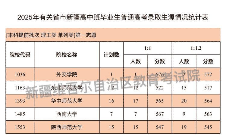 按照录取工作安排,2025年有关省市新疆高中班毕业生普通高考招生本科提前批次投档录取工作于7月19日开始,新疆教育考试院根据投档原则进行了投档,现将部分院校生源情况公布如下: