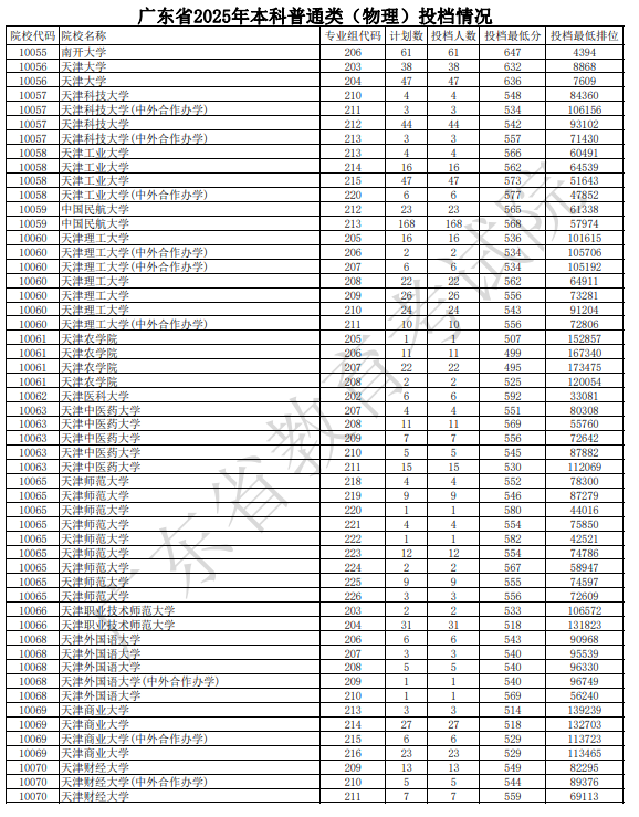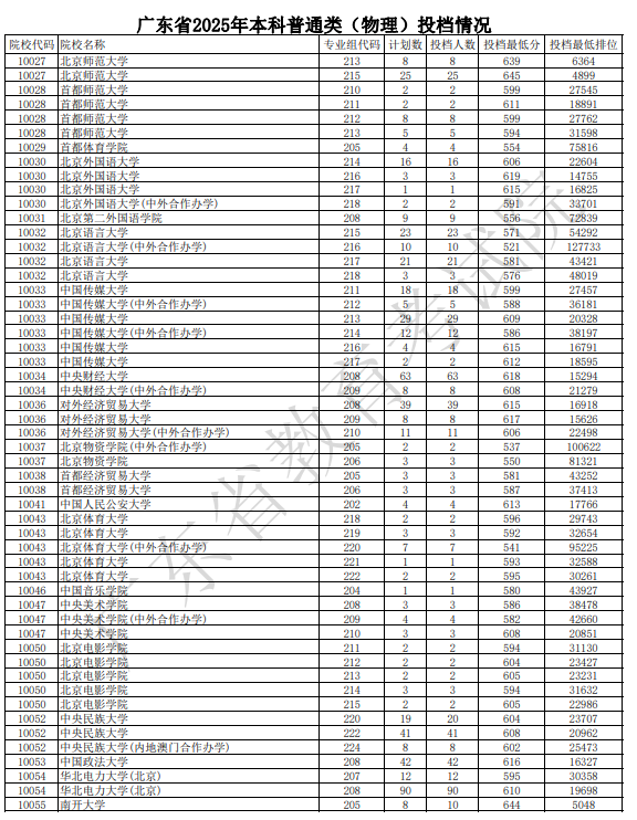 在普通类(物理)中,“清北复交”继续领跑。北京大学在粤招生最低投档分数线为689分,位居榜首;清华大学紧随其后,最低投档分数线为688分。上海交通大学和复旦大学也表现强劲,分别位列第三和第四。这些顶尖高校的投档线不仅分数高,而且位次也较为靠前,反映出考生对这些高校的高度青睐。