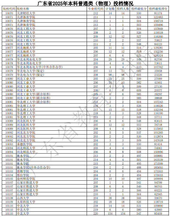 2025广东高考本科批院校录取投档最低分数线(物理类)