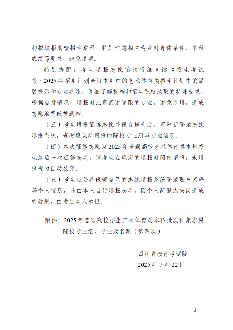 四川省2025年艺术体育类本科批次未完成计划院校第四次征集志愿的通知 时间:2025-07-23 四川 高考新闻 四川省2025年艺术体育类本科批次未完成计划院校第四次征集志愿的通知已发布,具体内容如下: