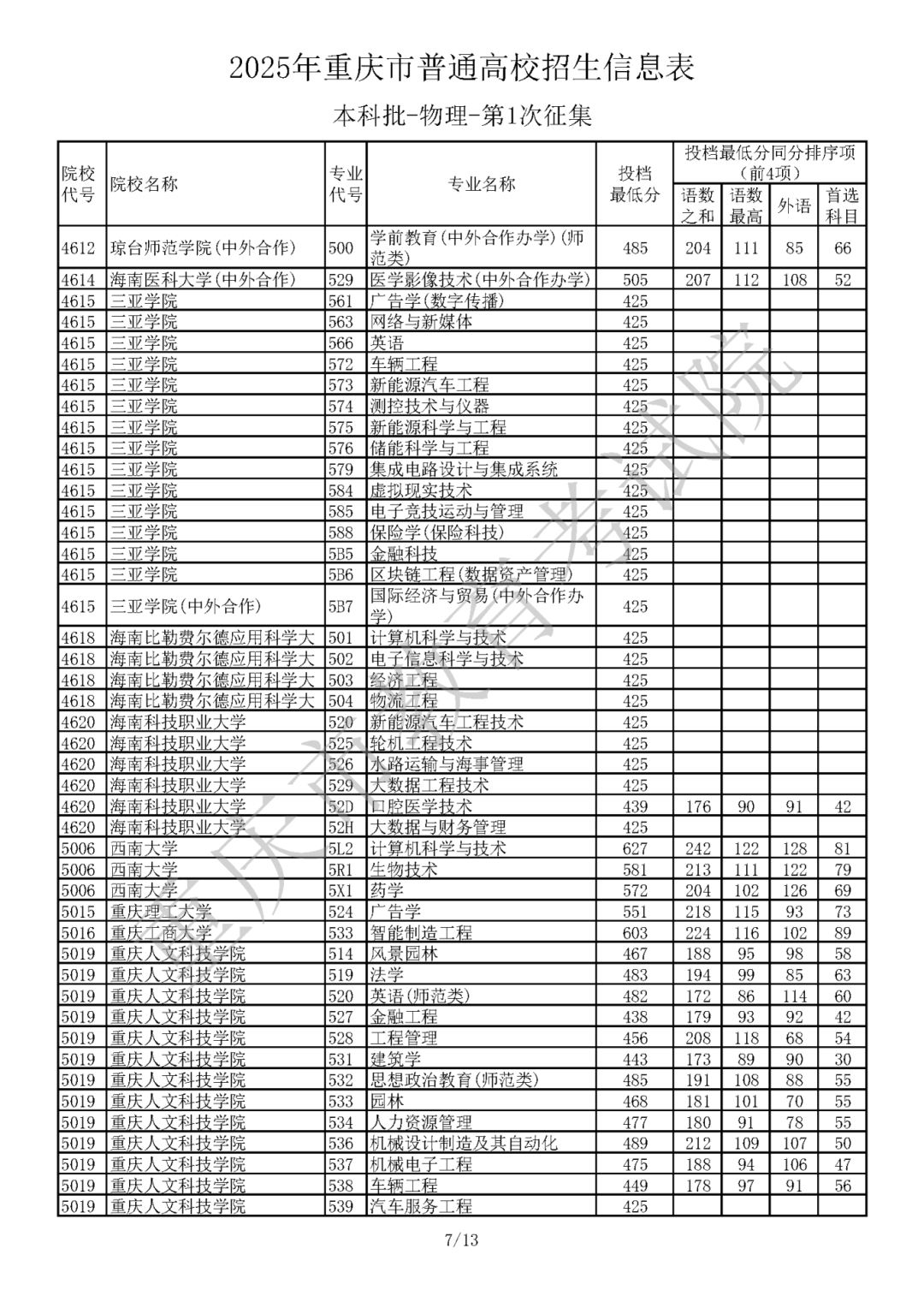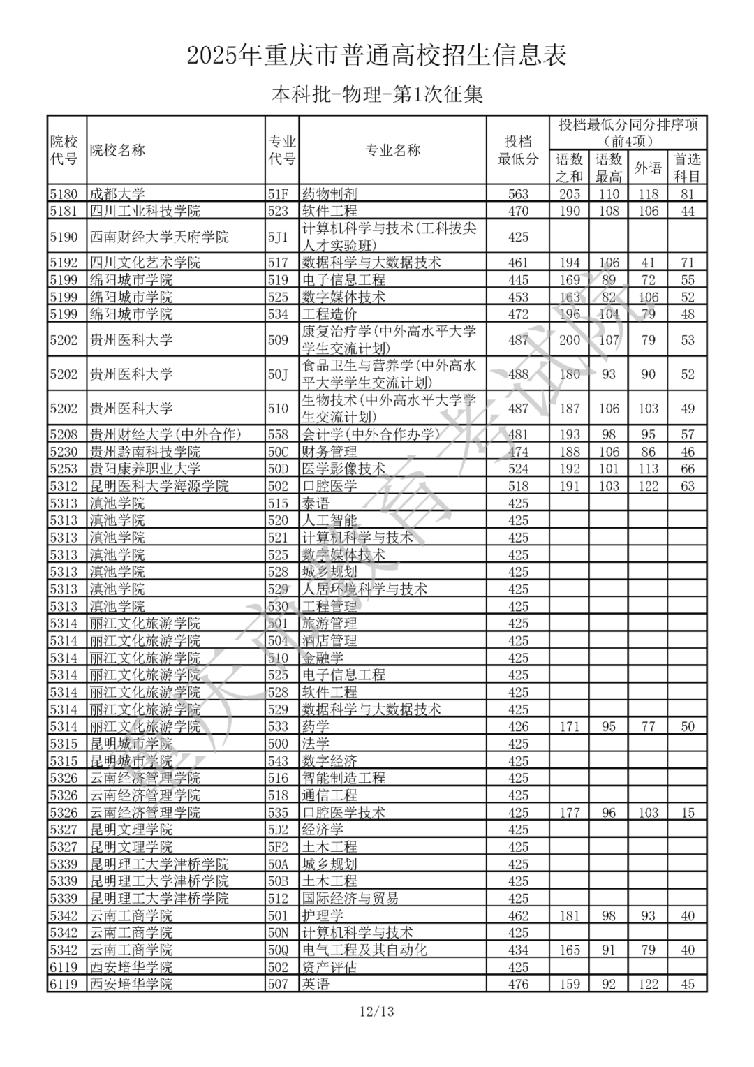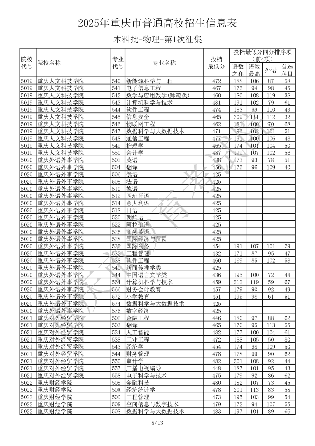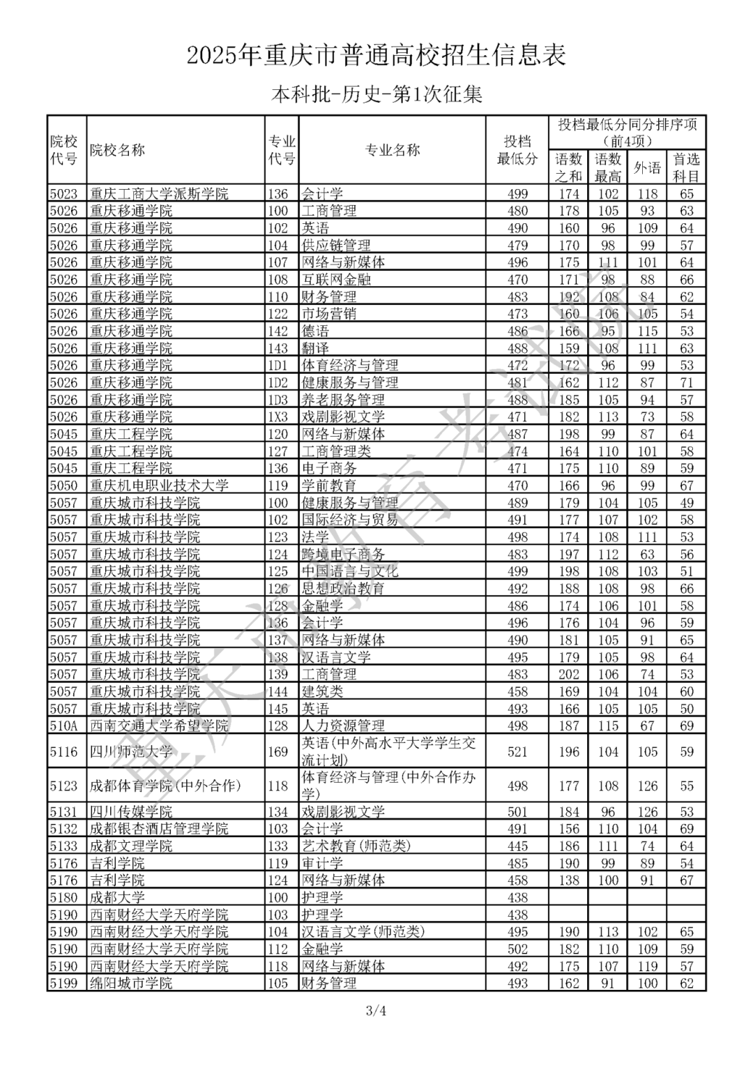 2025年重庆市普通高校招生信息表 普通类本科批(第1次征集)已发布,具体内容如下: