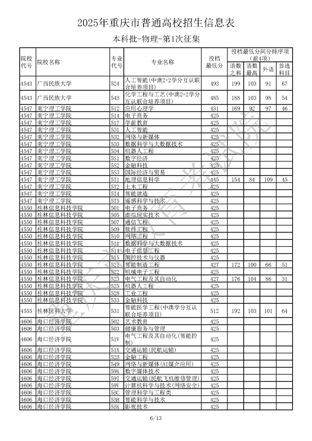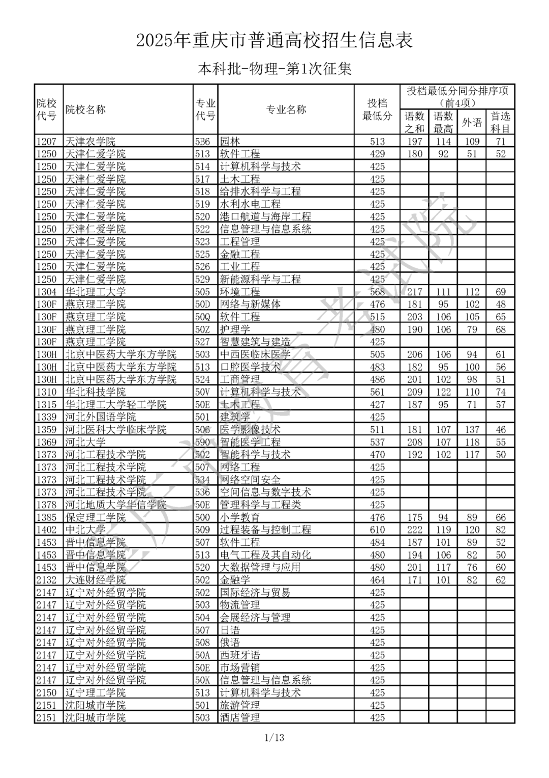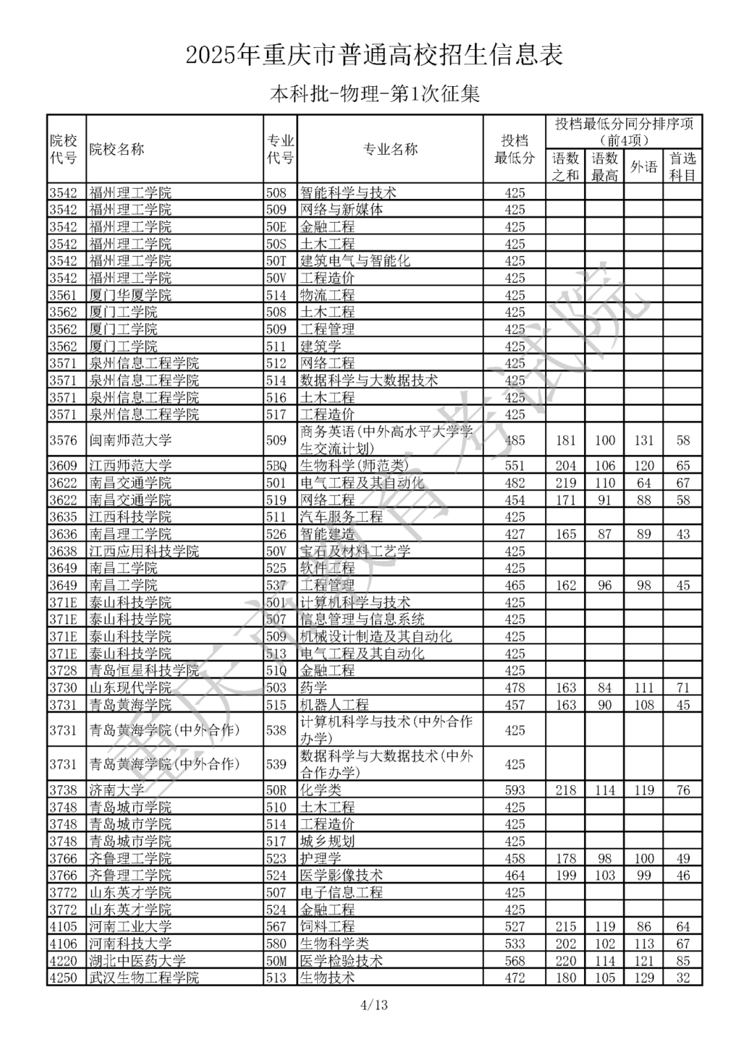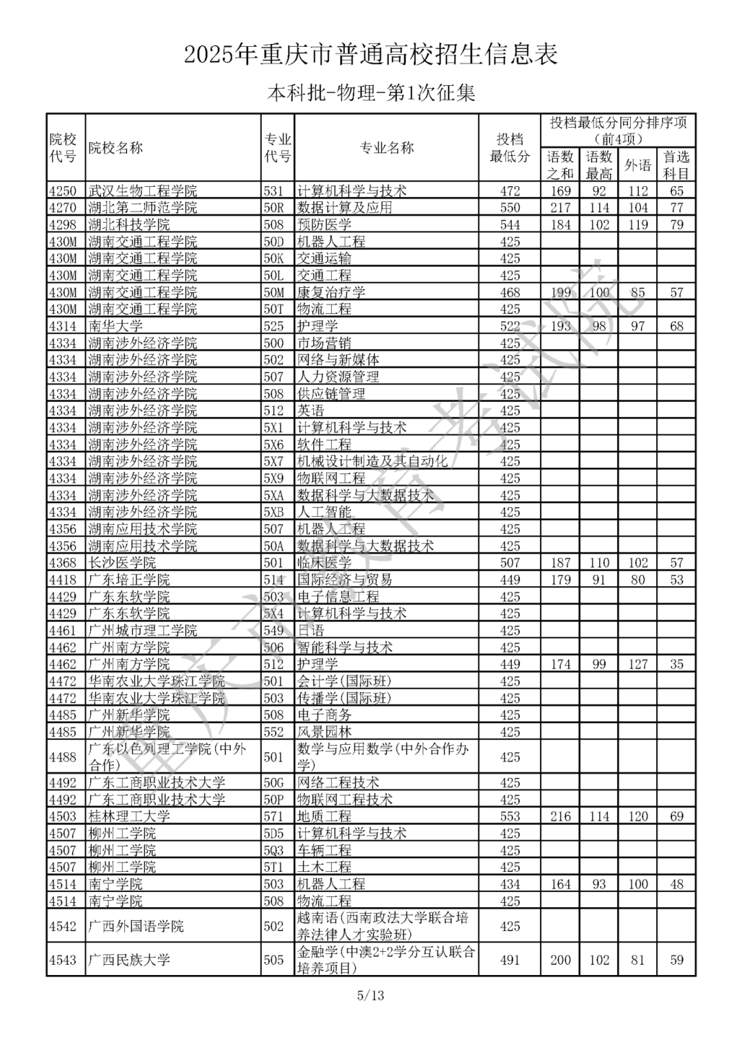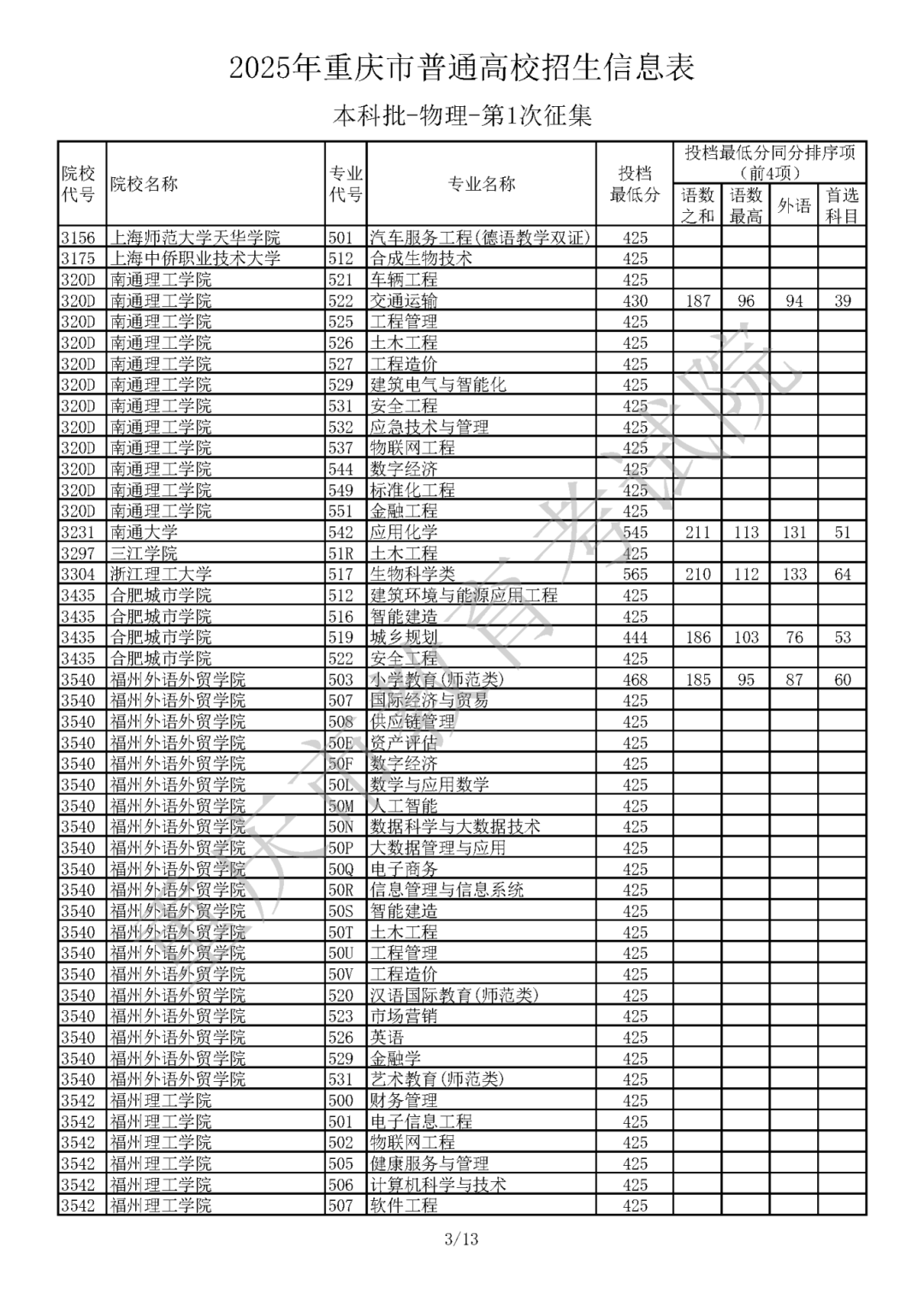 2025年重庆市普通高校招生信息表 普通类本科批(第1次征集)已发布,具体内容如下: