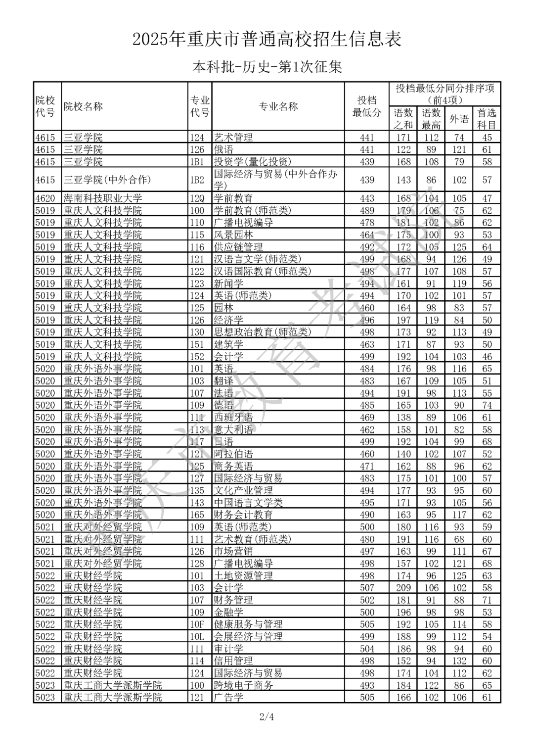 2025年重庆市普通高校招生信息表 本科批-历史-平行志愿