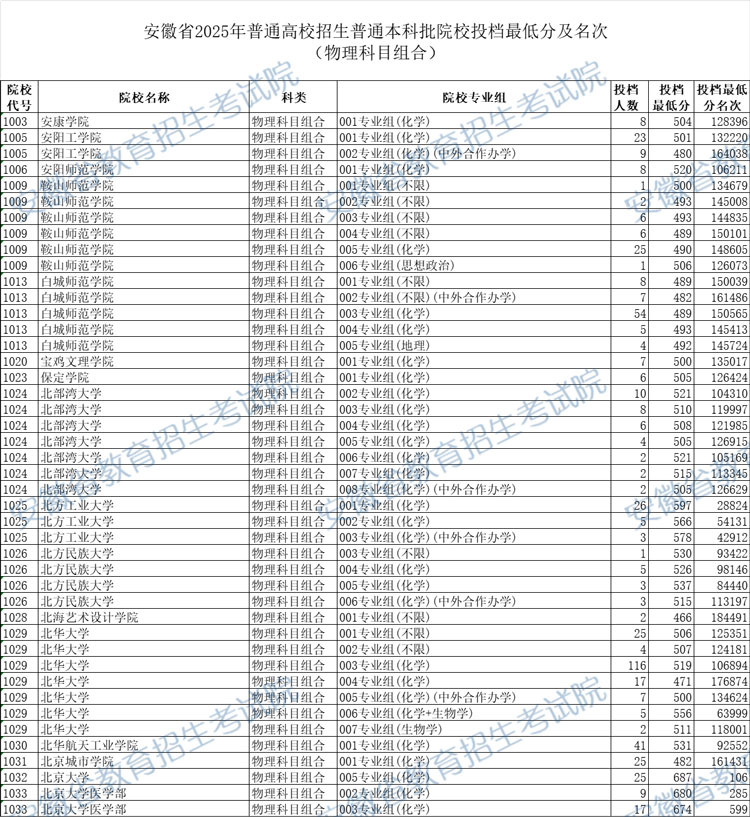 安徽省2025年普通高校招生普通本科批院校投档最低分及名次(物理科目组合) 时间:2025-07-25 安徽 高考新闻 安徽省2025年普通高校招生普通本科批院校投档最低分及名次(物理科目组合)已发布,具体内容如下: