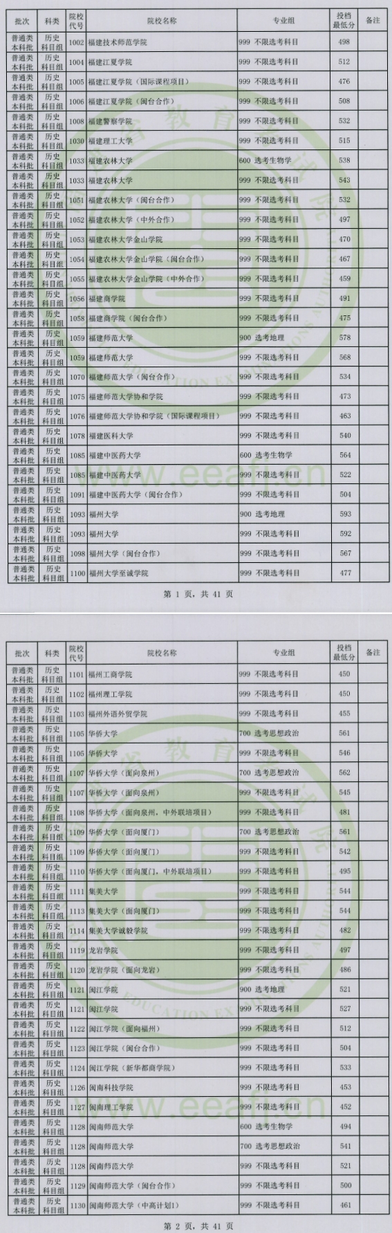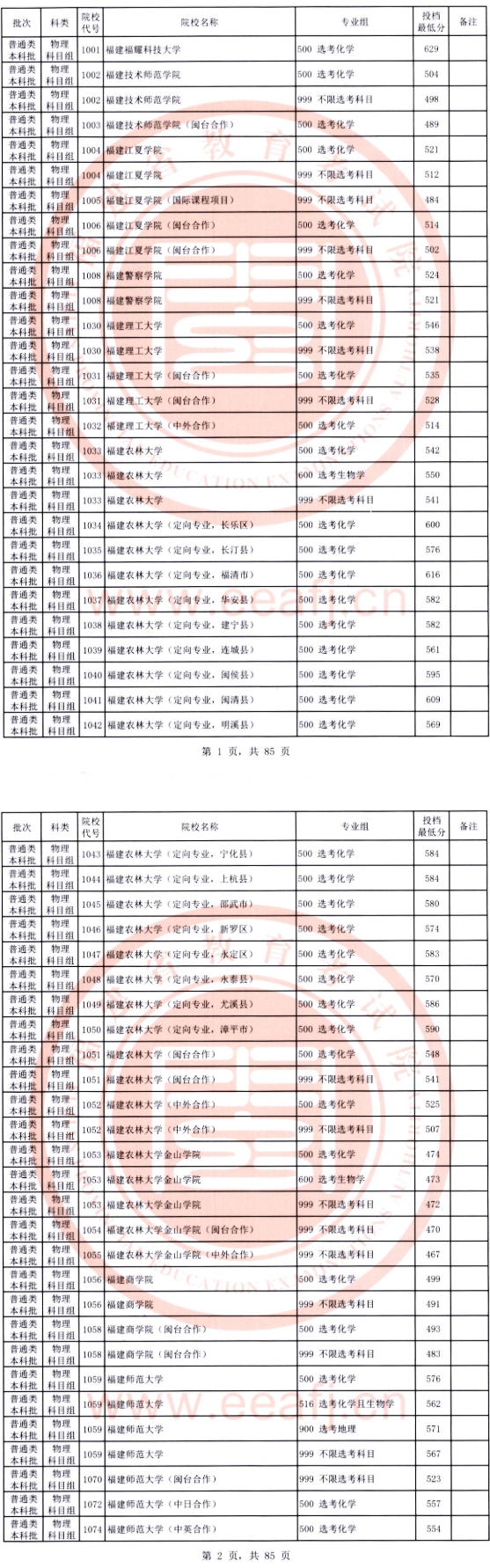 福建省2025年普通高校招生普通类本科批次平行志愿投档线正式公布: