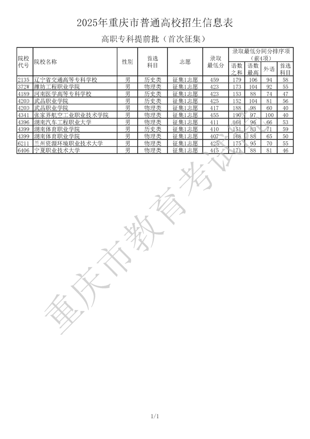 2025年重庆市普通高校招生信息表 普通类高职专科提前批(首次征集) 时间:2025-07-29 重庆 高考新闻 2025年重庆市普通高校招生信息表 普通类高职专科提前批(首次征集)已发布,具体内容如下: