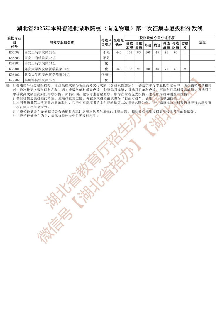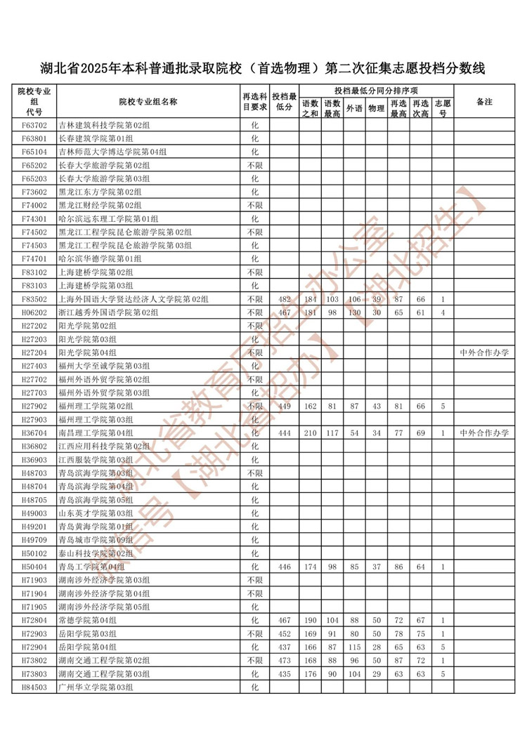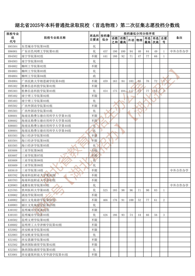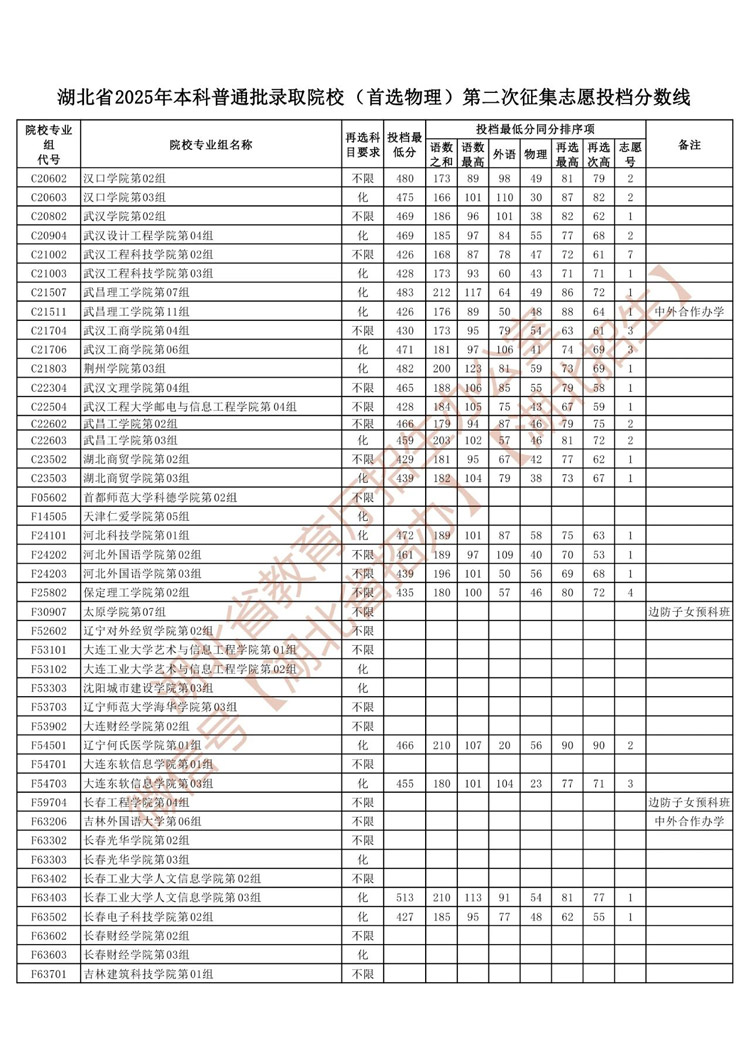 湖北省2025年本科普通批录取院校(首选物理)第二次征集志愿投档分数线 时间:2025-07-31 湖北 高考新闻 湖北省2025年本科普通批录取院校(首选物理)第二次征集志愿投档分数线已公布,具体内容如下: