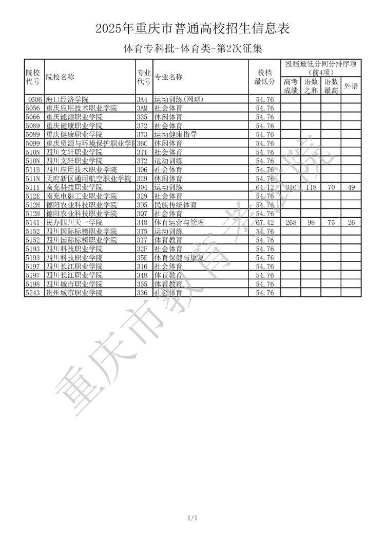 2025年重庆市普通高校招生信息表 体育专科批(第2次征集)已发布,具体内容如下: