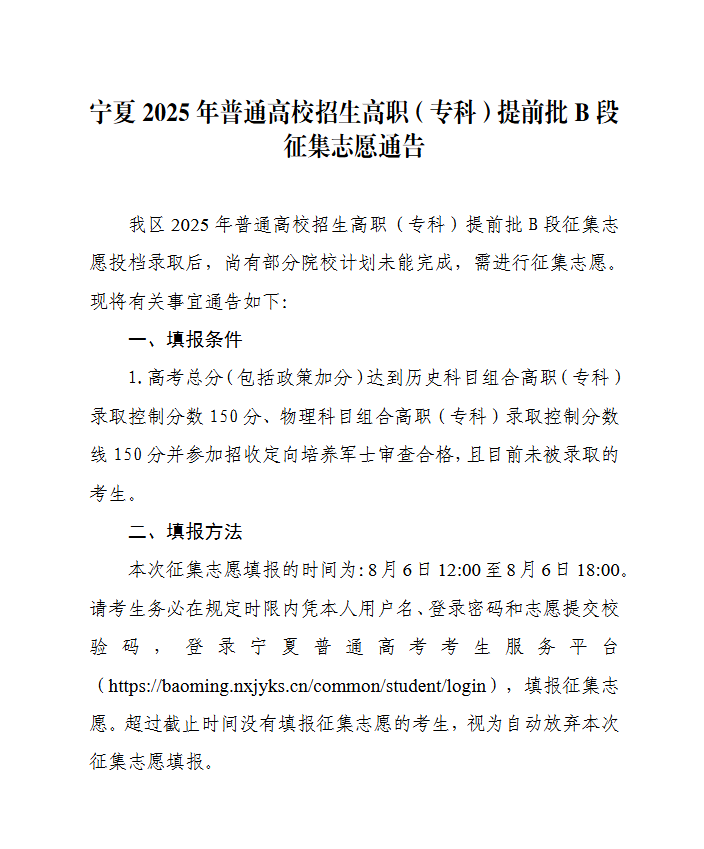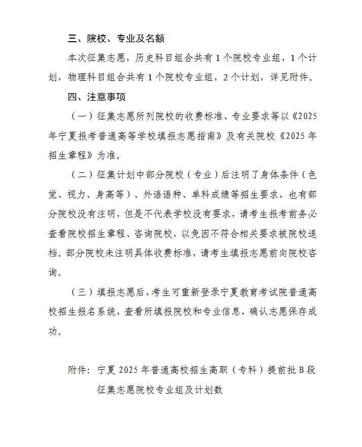 宁夏2025年普通高校招生高职(专科)提前批B段征集志愿通告 时间:2025-08-06 宁夏 高考新闻 宁夏2025年普通高校招生高职(专科)提前批B段征集志愿通告已发布,具体内容如下: 附件: [1] 宁夏2025年普通高校招生高职(专科)提前批B段征集志愿院校专业组及计划数.pdf