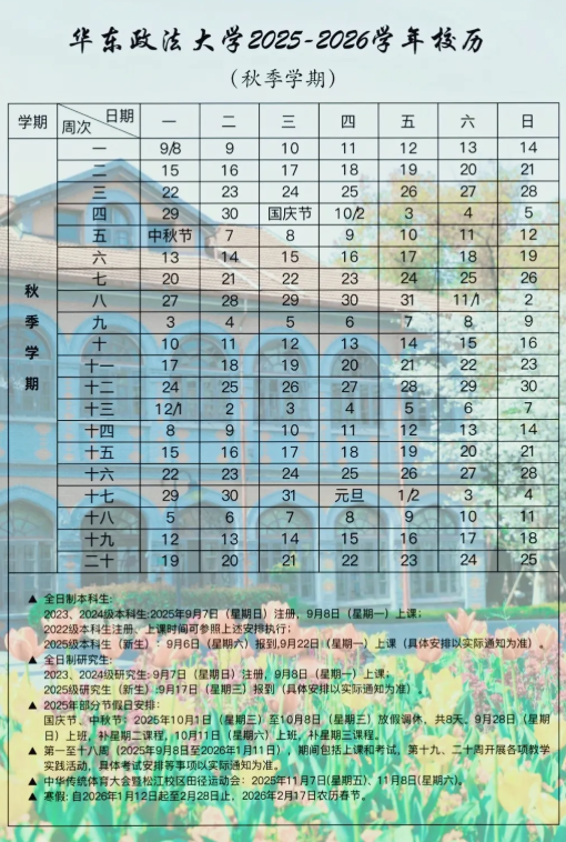 2023、2024级本科生:2025年9月7日(星期日)注册,9月8日(星期一)上课。