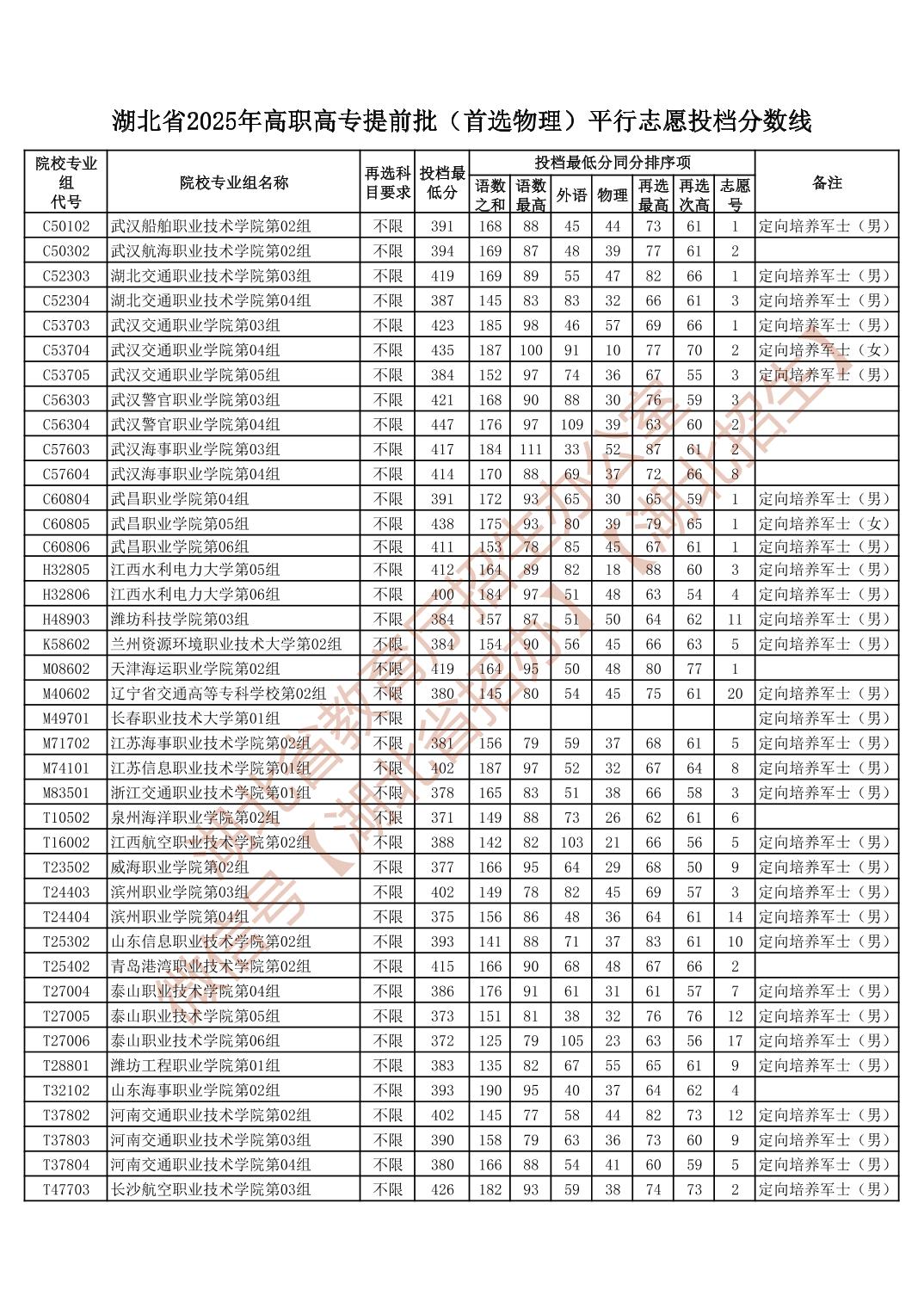 湖北省2025年高职高专提前批(首选物理)平行志愿投档分数线已发布,具体内容如下: