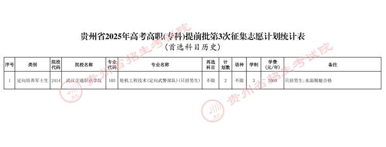 关于贵州省2025年普通高校招生高职(专科)提前批第3次征集志愿的通告