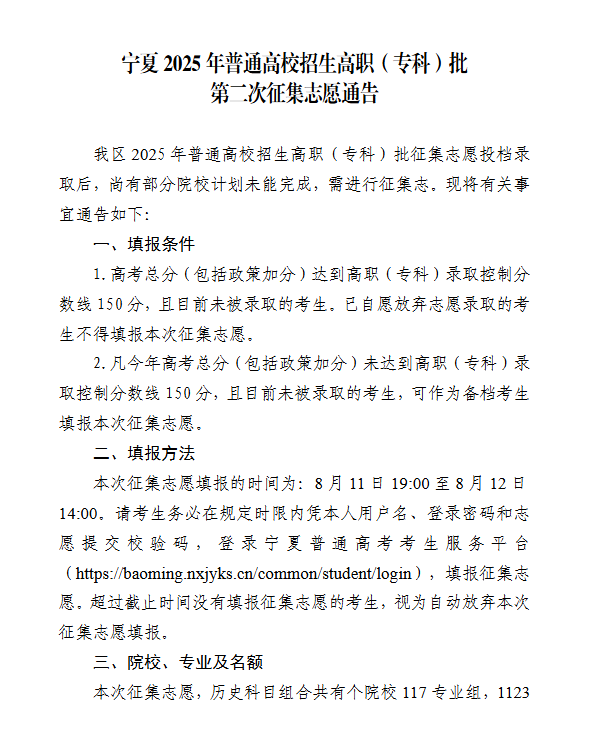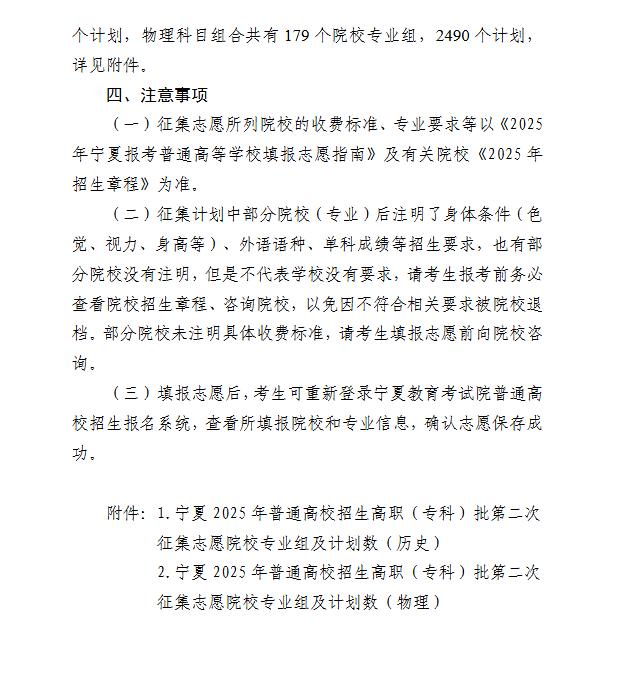 宁夏2025年普通高校招生高职(专科)批第二次征集志愿通告 时间:2025-08-12 宁夏 高考新闻 宁夏2025年普通高校招生高职(专科)批第二次征集志愿通告已发布,具体内容如下: 附件: 点击下载:宁夏2025年普通高校招生高职(专科)批第二次征集志愿院校专业组及计划数(物理).pdf 点击下载:宁夏2025年普通高校招生高职(专科)批第二次征集志愿院校专业组及计划数(历史).pdf