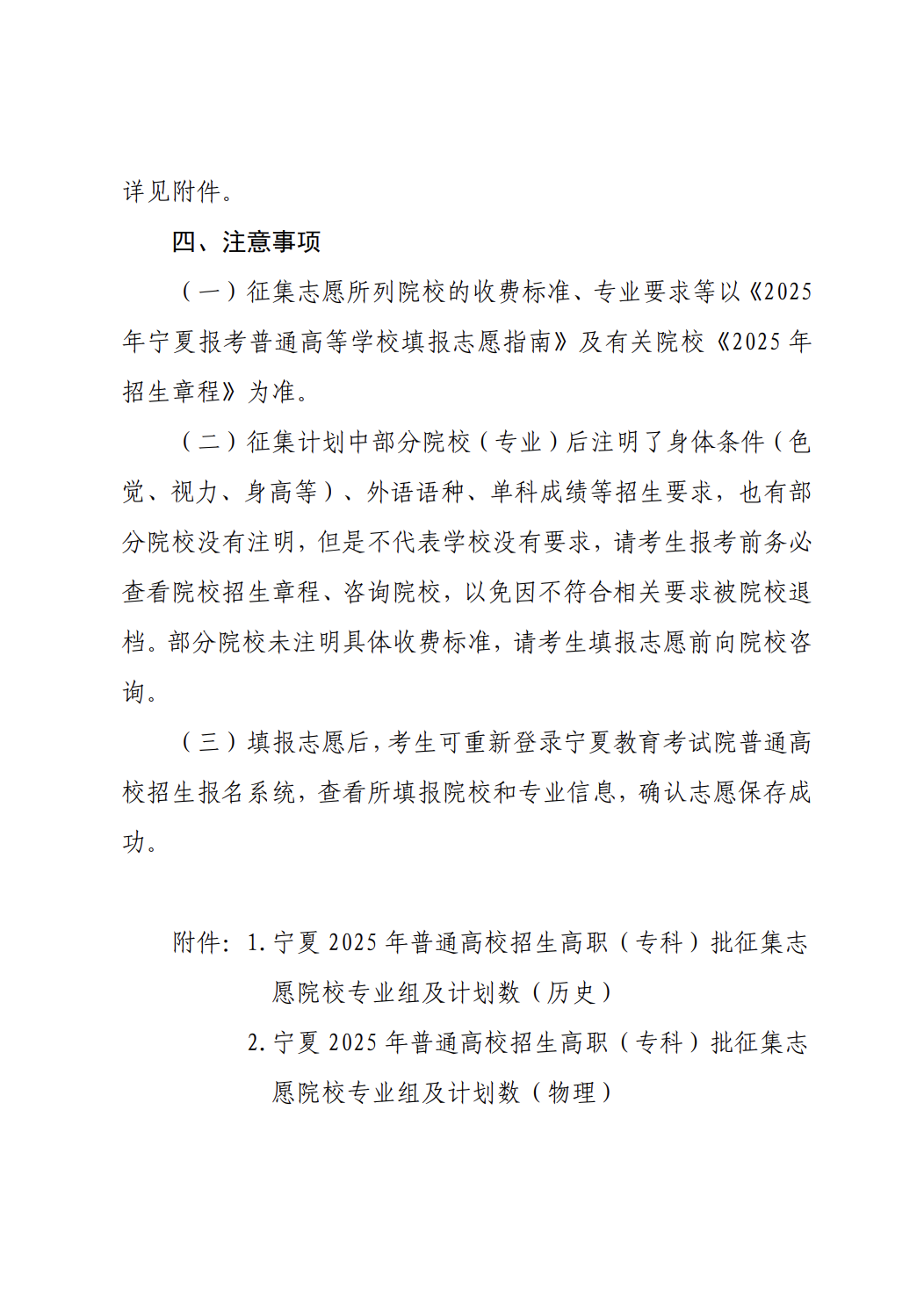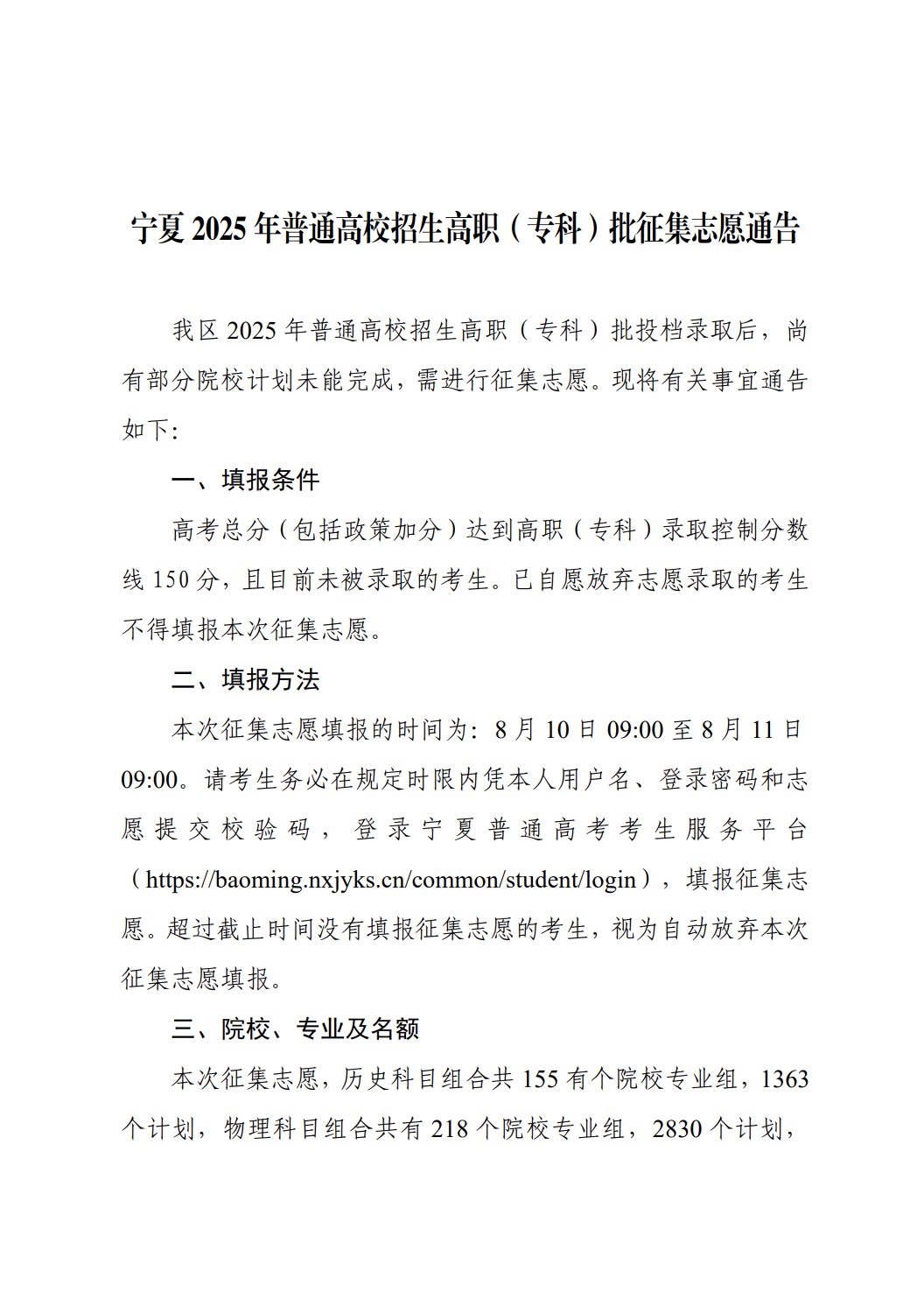 宁夏2025年普通高校招生高职(专科)批征集志愿通告 时间:2025-08-12 宁夏 高考新闻 宁夏2025年普通高校招生高职(专科)批征集志愿通告已发布,具体内容如下: 附件: [1] 宁夏2025年普通高校招生高职(专科)批征集志愿院校专业组及计划数(历史).pdf [2] 宁夏2025年普通高校招生高职(专科)批征集志愿院校专业组及计划数(物理).pdf