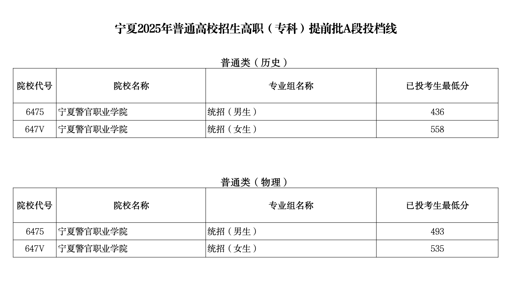 宁夏2025年普通高校招生高职(专科)批投档线