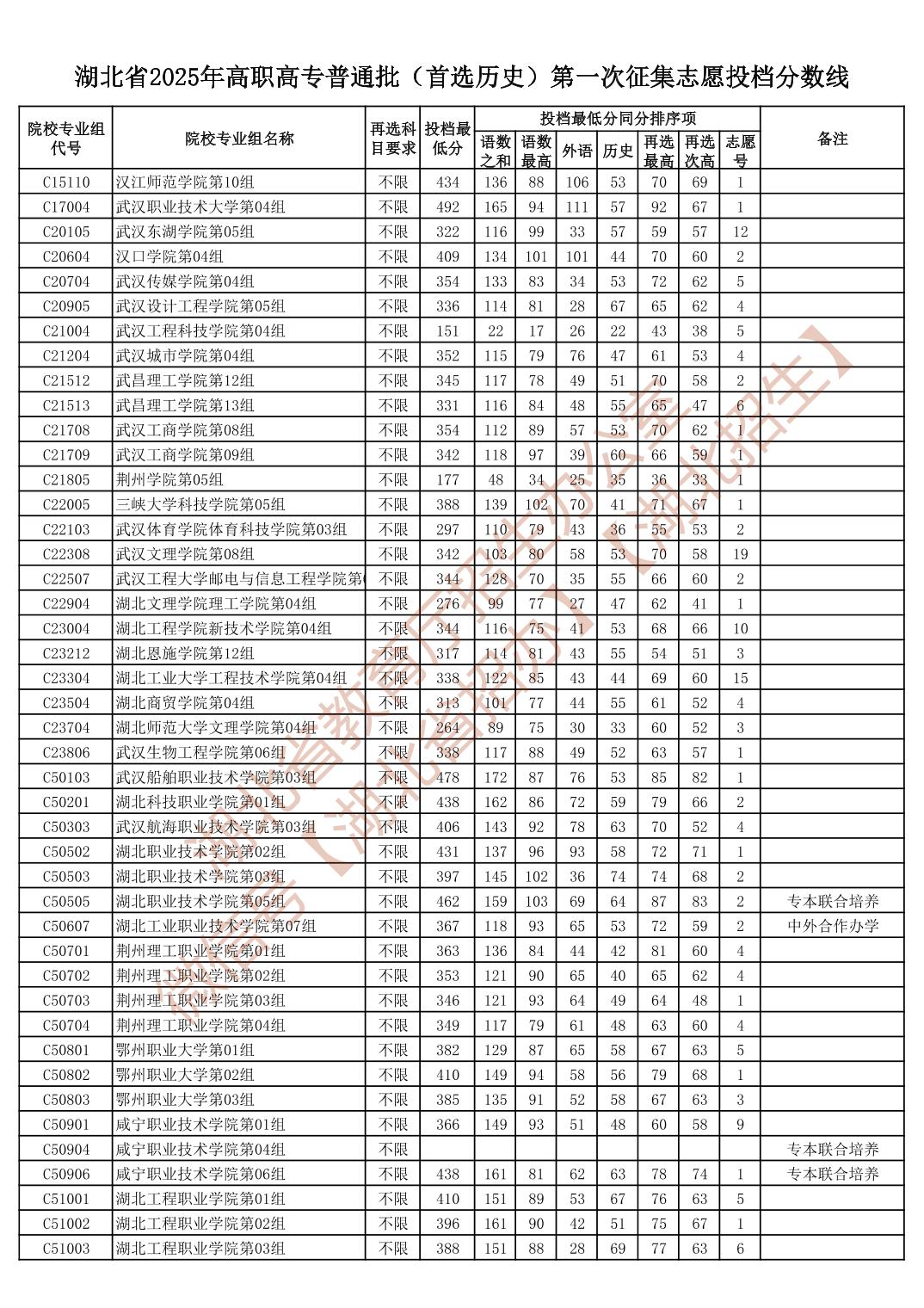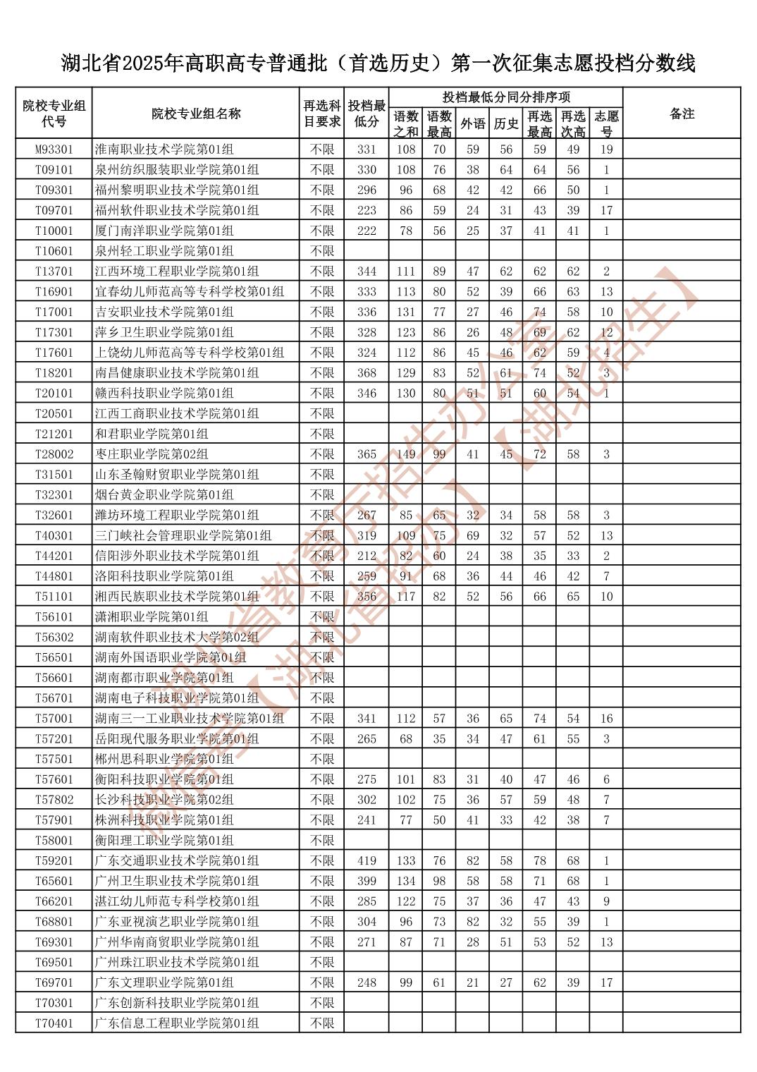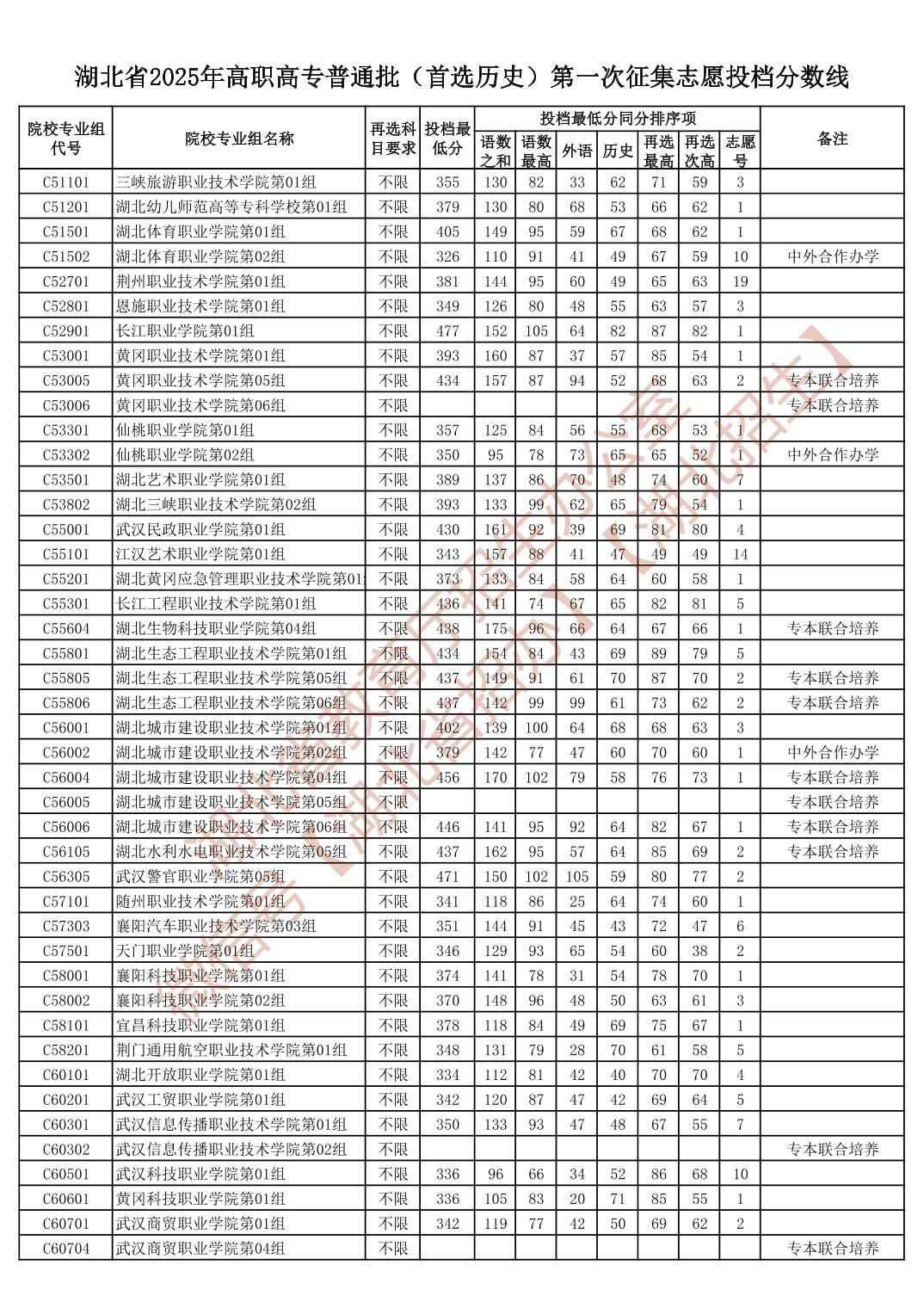 湖北省2025年高职高专普通批(首选历史)第一次征集志愿投档分数线