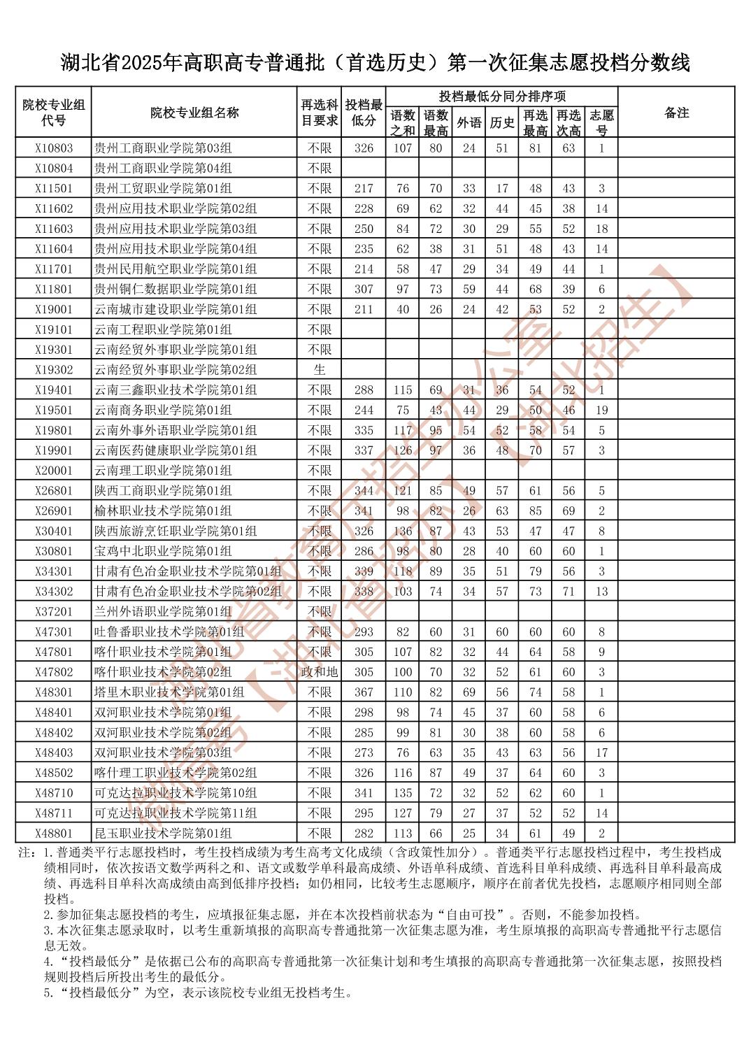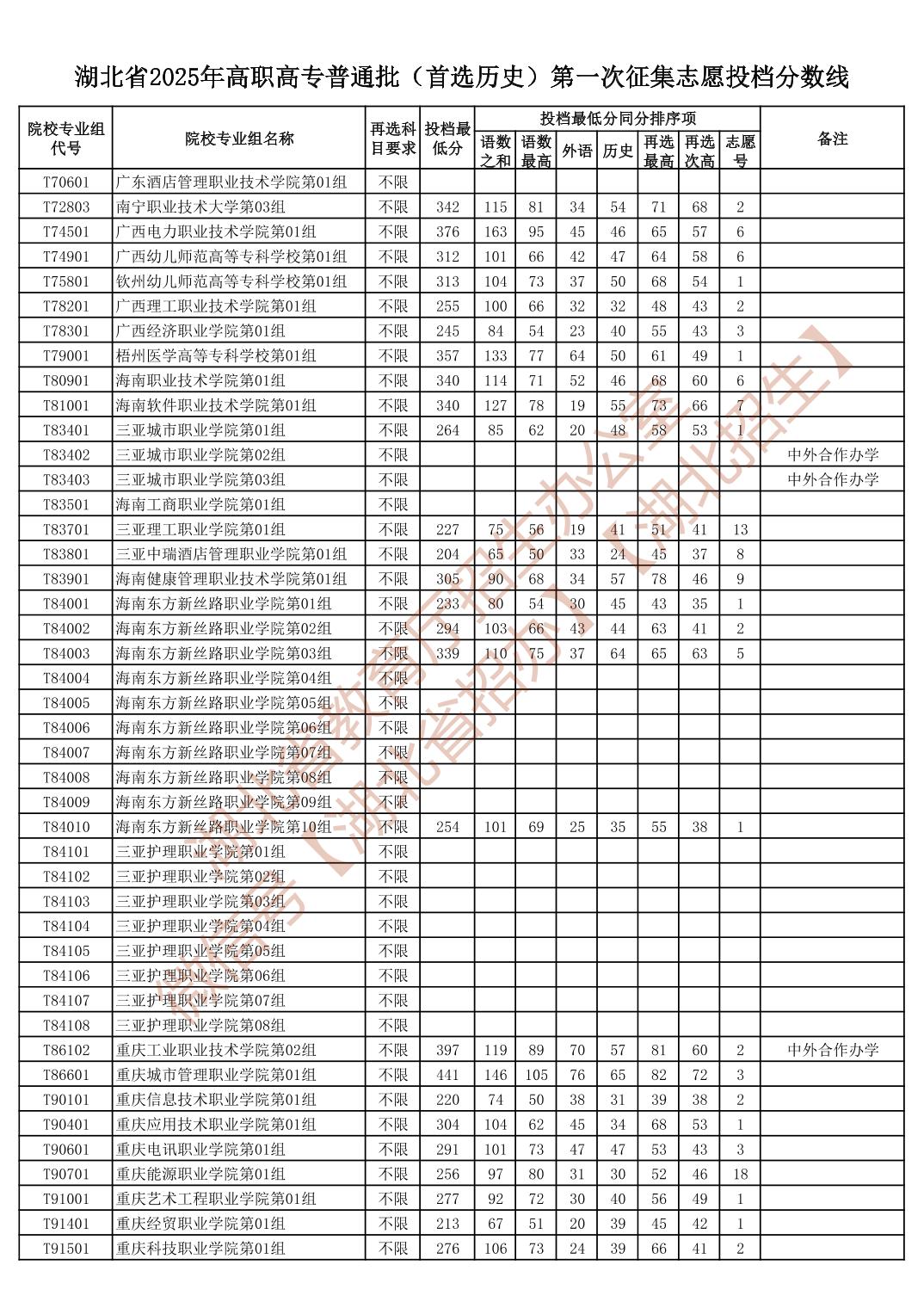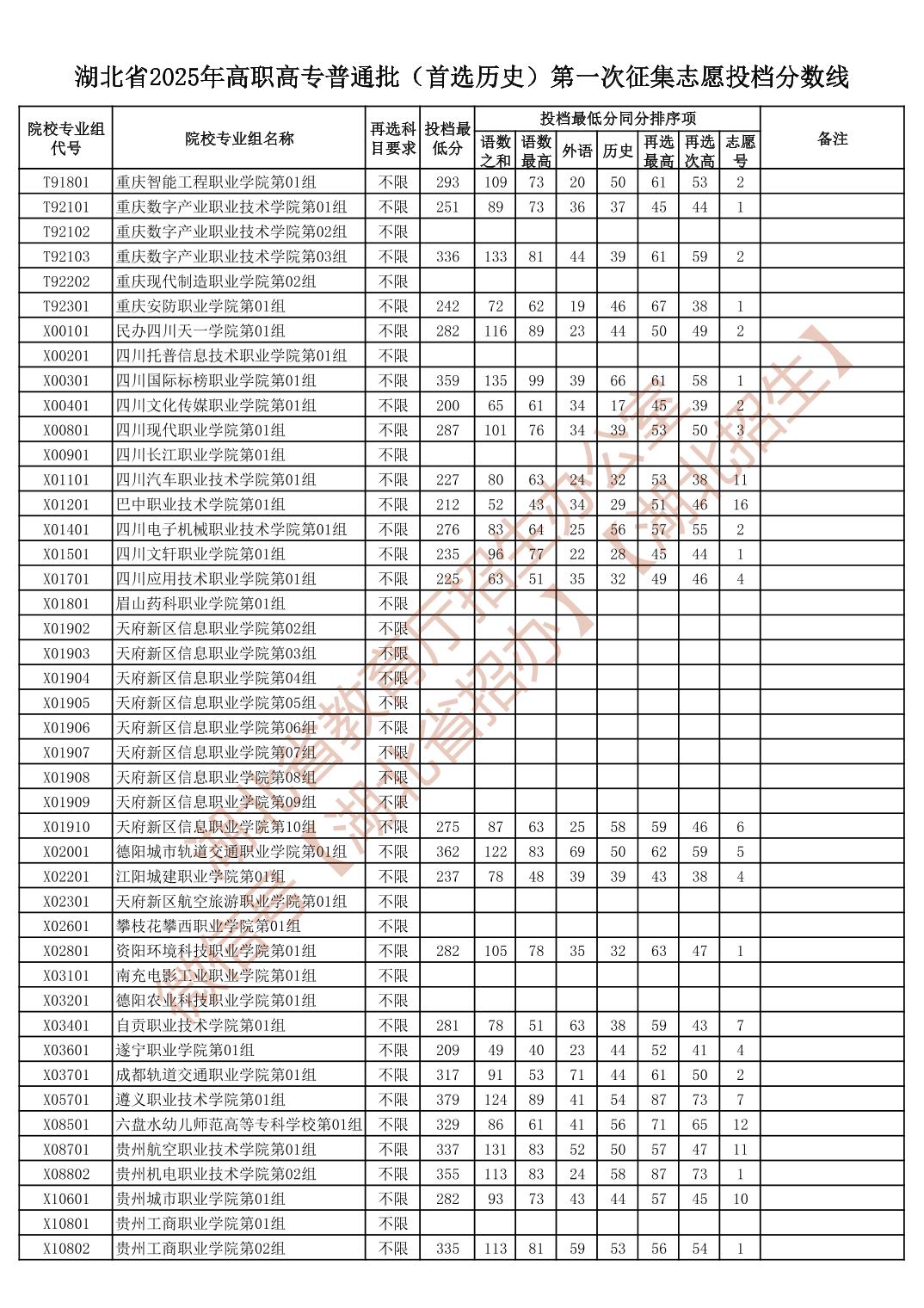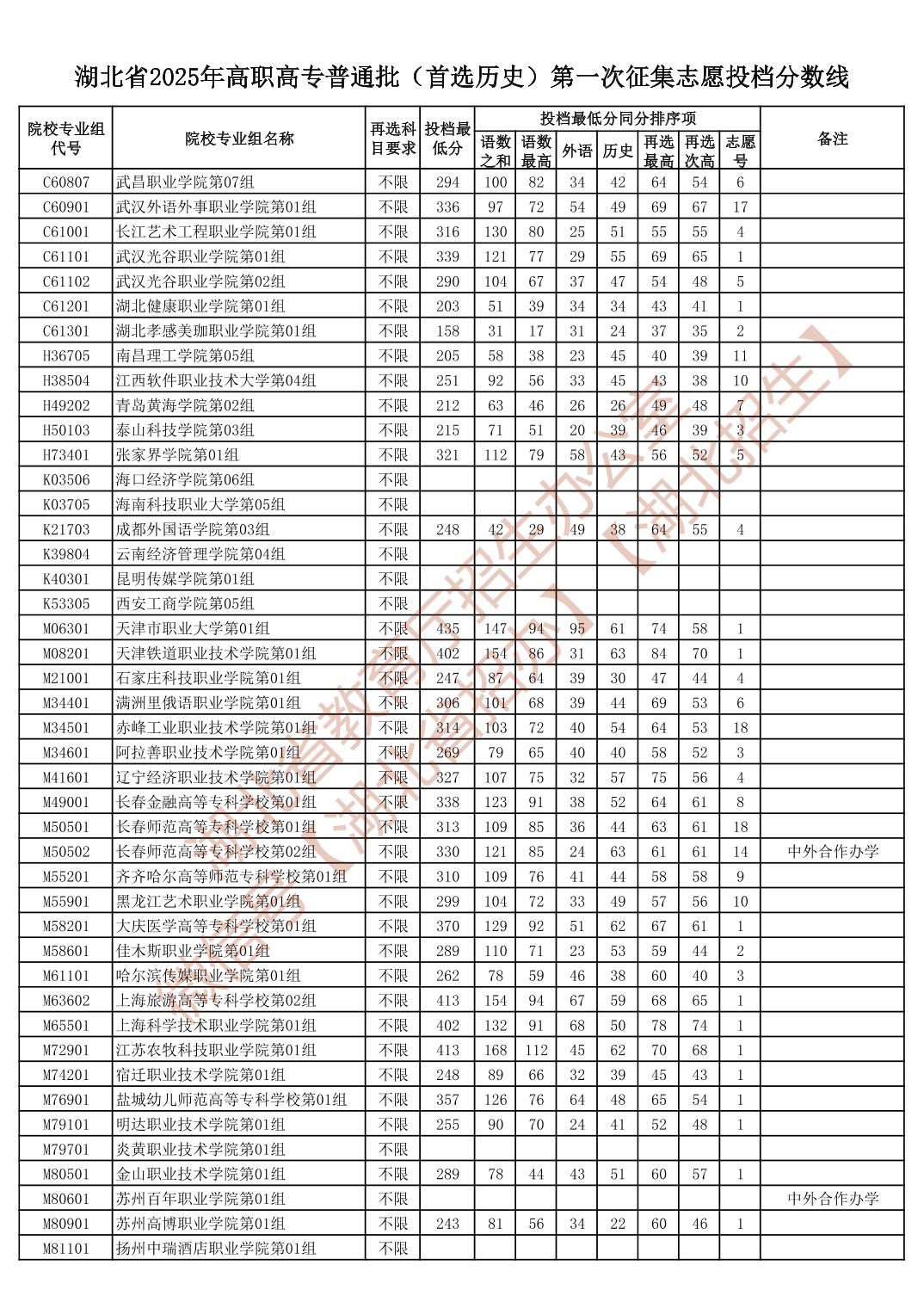 湖北省2025年高职高专普通批(首选历史)第一次征集志愿投档分数线