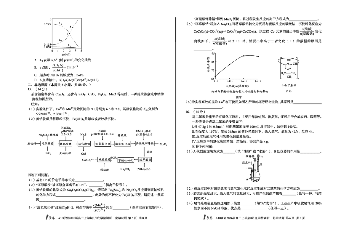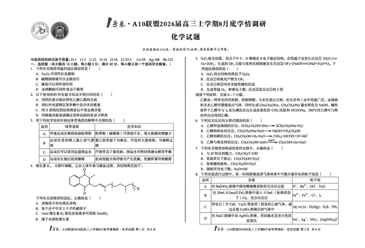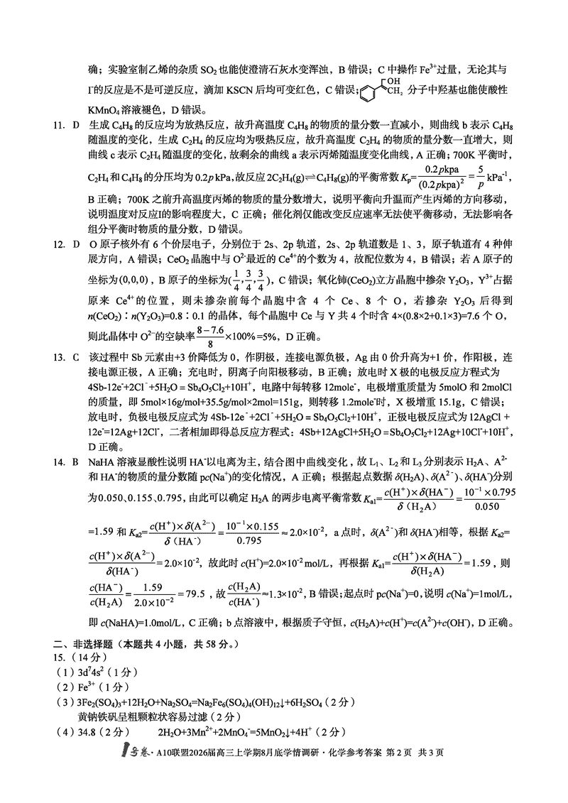 安徽省1号卷·A10联盟2026届高三上学期8月底学情调研化学试题及答案