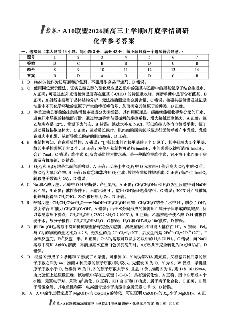 安徽省1号卷·A10联盟2026届高三上学期8月底学情调研化学考试已于近日开考,为方便考生考后及时查看考试情况,查漏补缺、弥补不足,本文整理了试题答案解析相关信息!