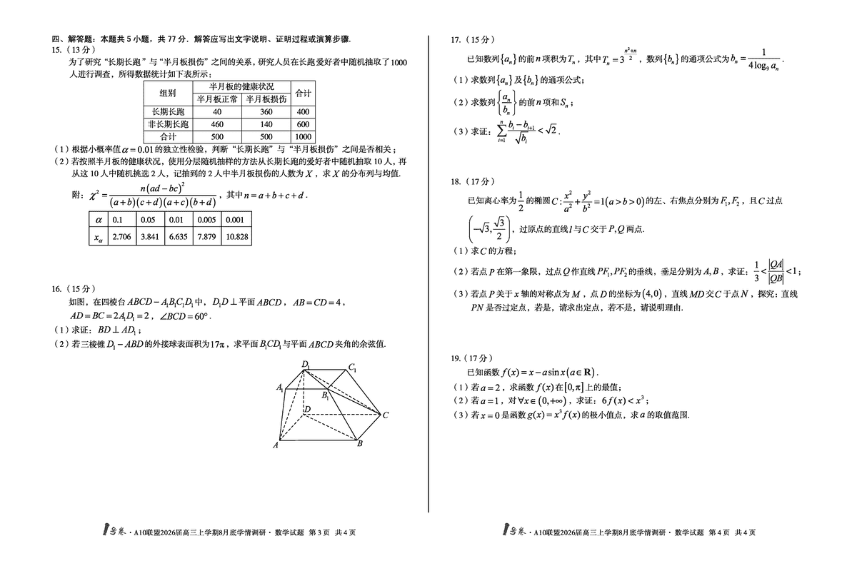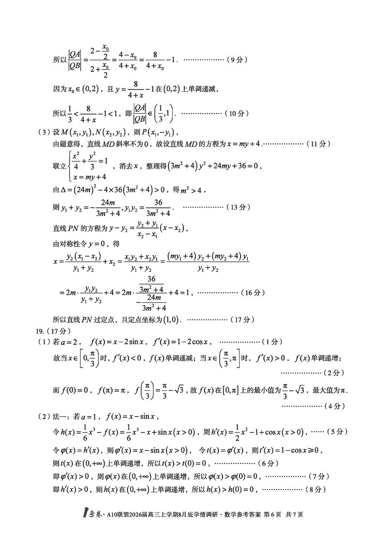 安徽省1号卷·A10联盟2026届高三上学期8月底学情调研数学试题及答案