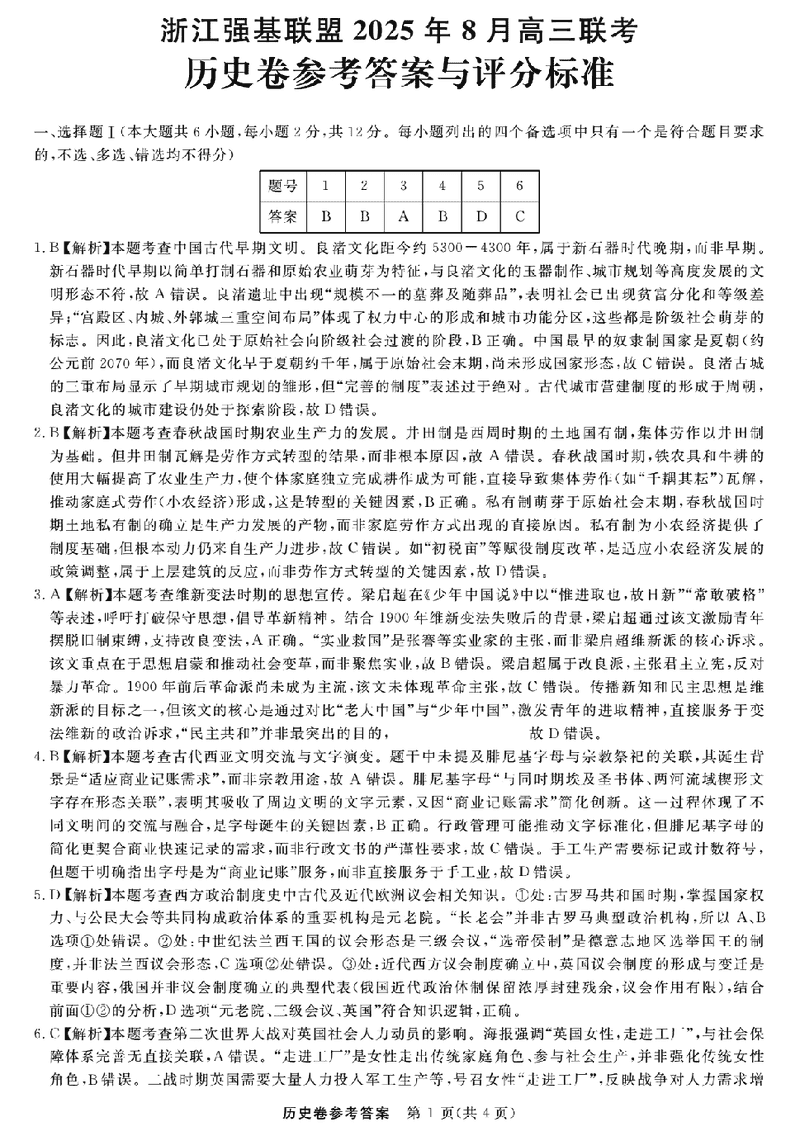 浙江强基联盟2025年8月高三联考历史试题及答案 时间:2025-08-30 浙江 文综试题 浙江强基联盟2025年8月高三联考历史考试已于近日开考,为方便考生考后及时查看考试情况,查漏补缺、弥补不足,本文整理了试题答案解析相关信息! 汇总:浙江强基联盟2025年8月高三联考 历史试题及答案解析