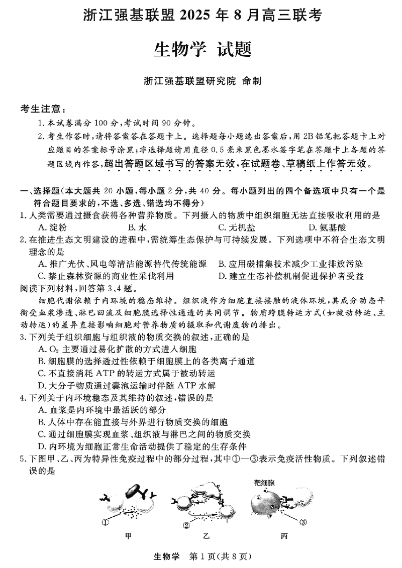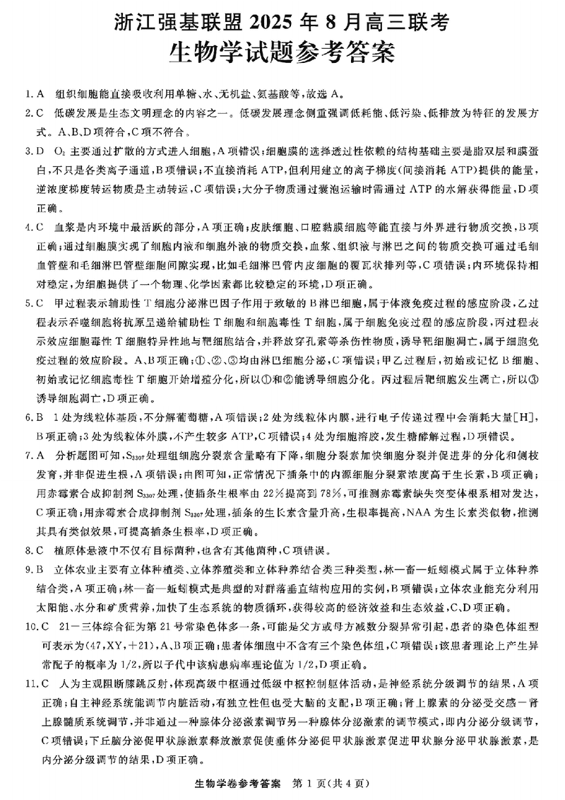 浙江强基联盟2025年8月高三联考生物试题及答案 时间:2025-08-30 浙江 理综试题 浙江强基联盟2025年8月高三联考生物考试已于近日开考,为方便考生考后及时查看考试情况,查漏补缺、弥补不足,本文整理了试题答案解析相关信息! 汇总:浙江强基联盟2025年8月高三联考 生物试题及答案解析