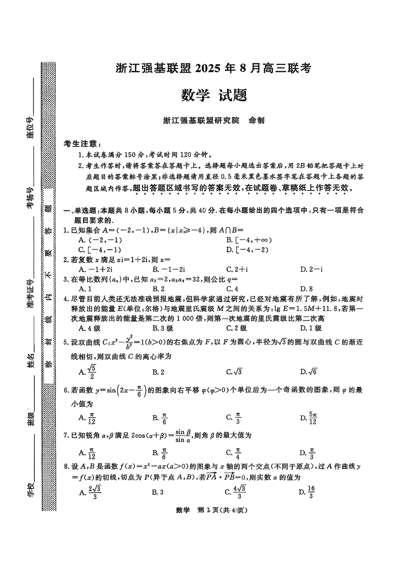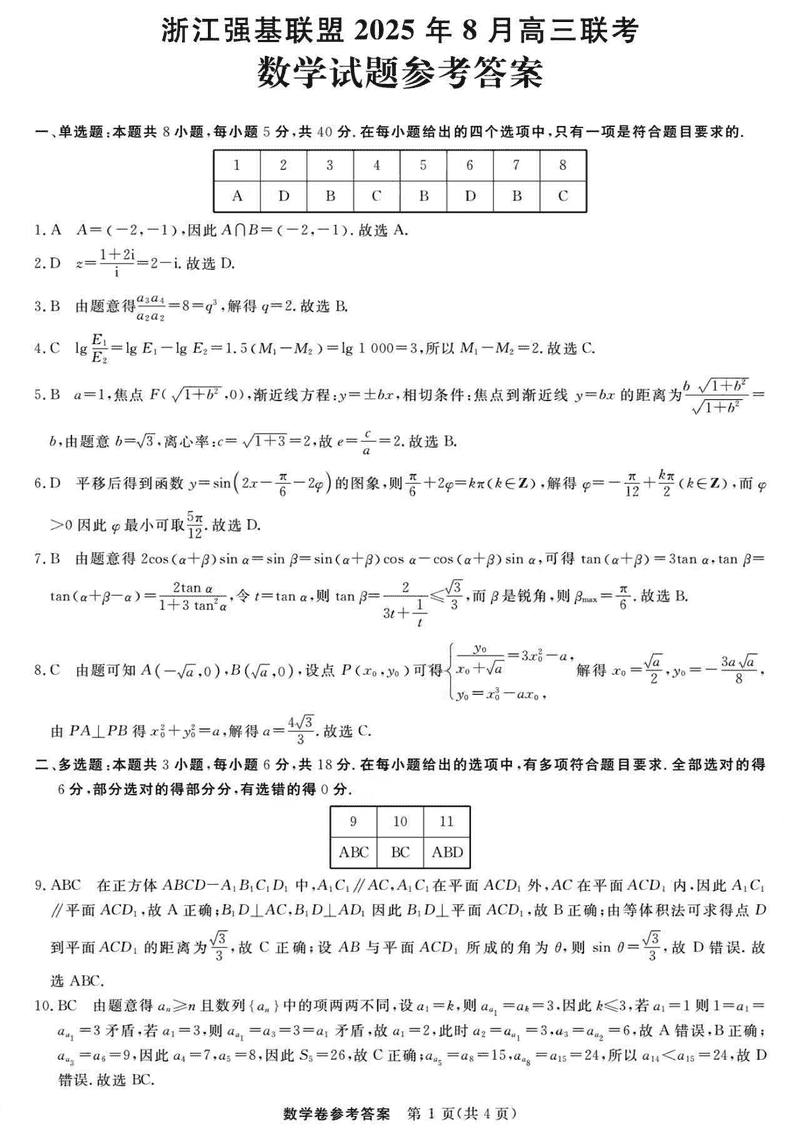 浙江强基联盟2025年8月高三联考数学试题及答案 时间:2025-08-30 浙江 数学试题 浙江强基联盟2025年8月高三联考数学考试已于近日开考,为方便考生考后及时查看考试情况,查漏补缺、弥补不足,本文整理了试题答案解析相关信息! 汇总:浙江强基联盟2025年8月高三联考 数学试题及答案解析