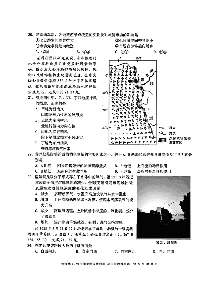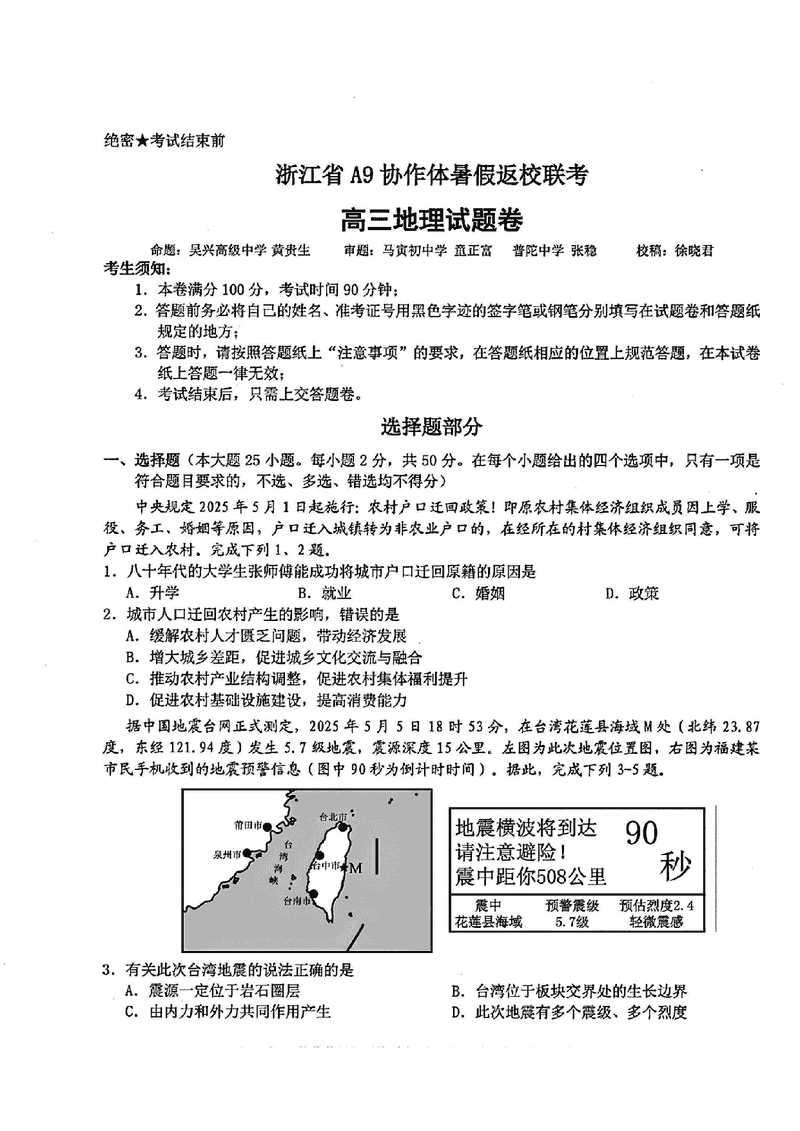 浙江A9协作体2026届高三暑假返校联考地理试题及答案 时间:2025-08-30 浙江 文综试题 浙江省A9协作体2026届高三暑假返校联考地理考试已于近日开考,为方便考生考后及时查看考试情况,查漏补缺、弥补不足,本文整理了试题答案解析相关信息! 汇总:浙江省A9协作体2026届高三暑假返校联考 地理试题及答案解析