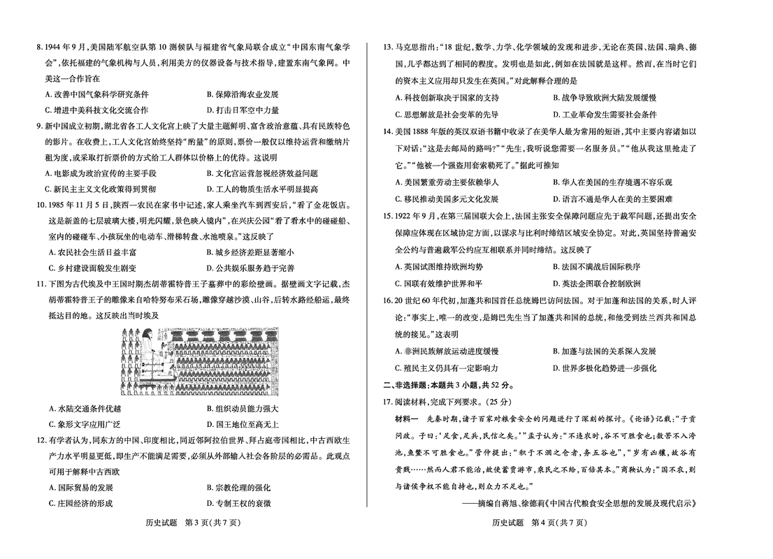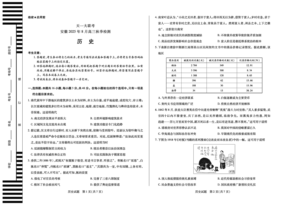 安徽天一大联考2026届高三8月秋季检测历史试题及答案