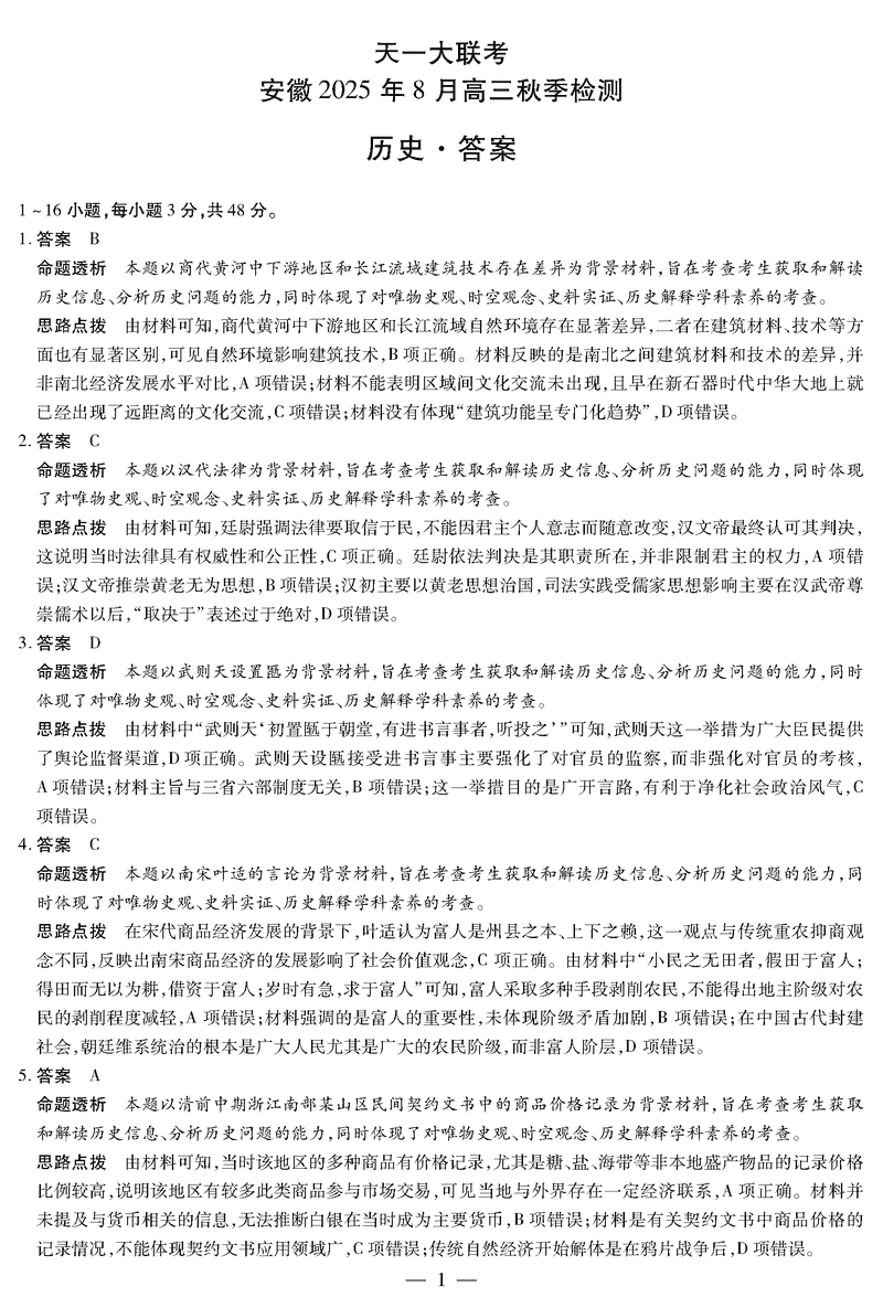 安徽省天一大联考2026届高三8月秋季检测历史考试已于近日开考,为方便考生考后及时查看考试情况,查漏补缺、弥补不足,本文整理了试题答案解析相关信息!