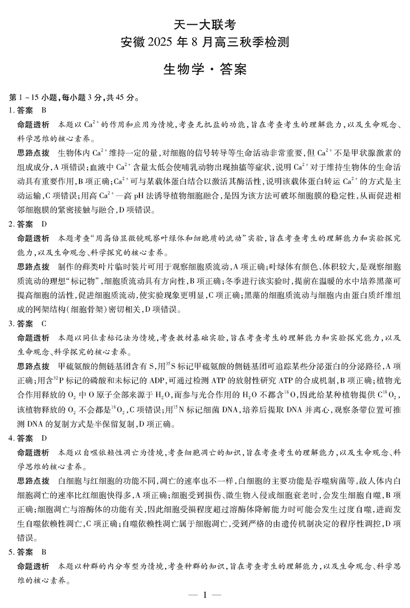安徽天一大联考2026届高三8月秋季检测生物试题及答案