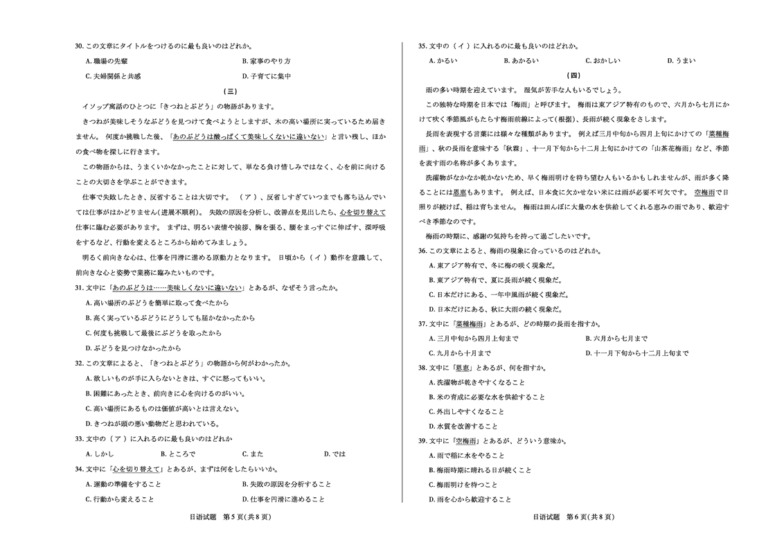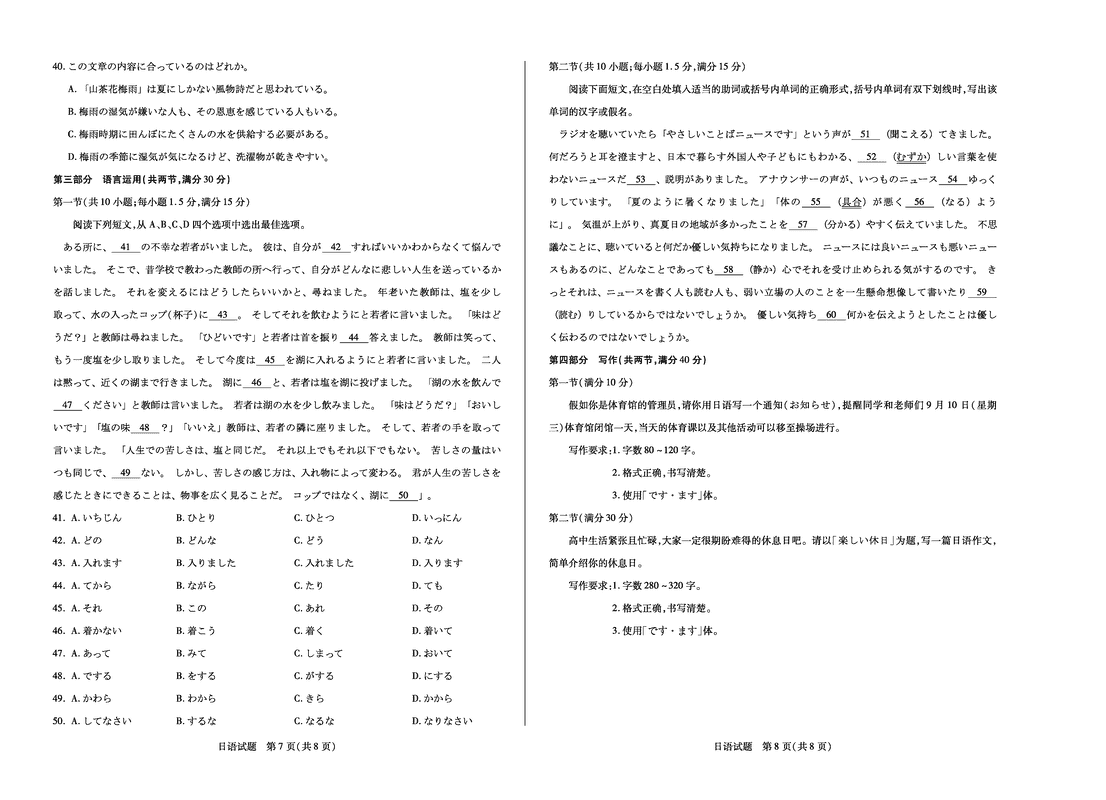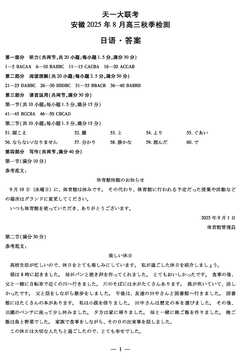 安徽天一大联考2026届高三8月秋季检测日语试题及答案