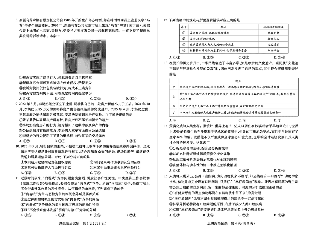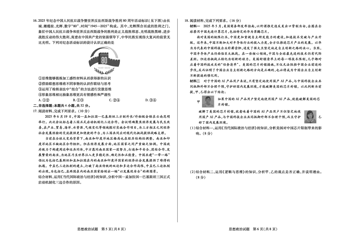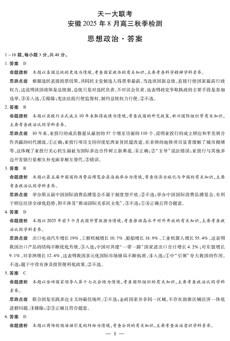安徽天一大联考2026届高三8月秋季检测政治试题及答案