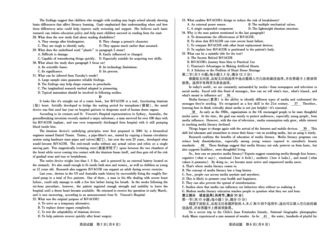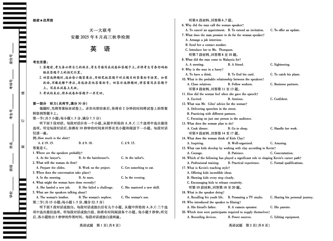 安徽天一大联考2026届高三8月秋季检测英语试题及答案