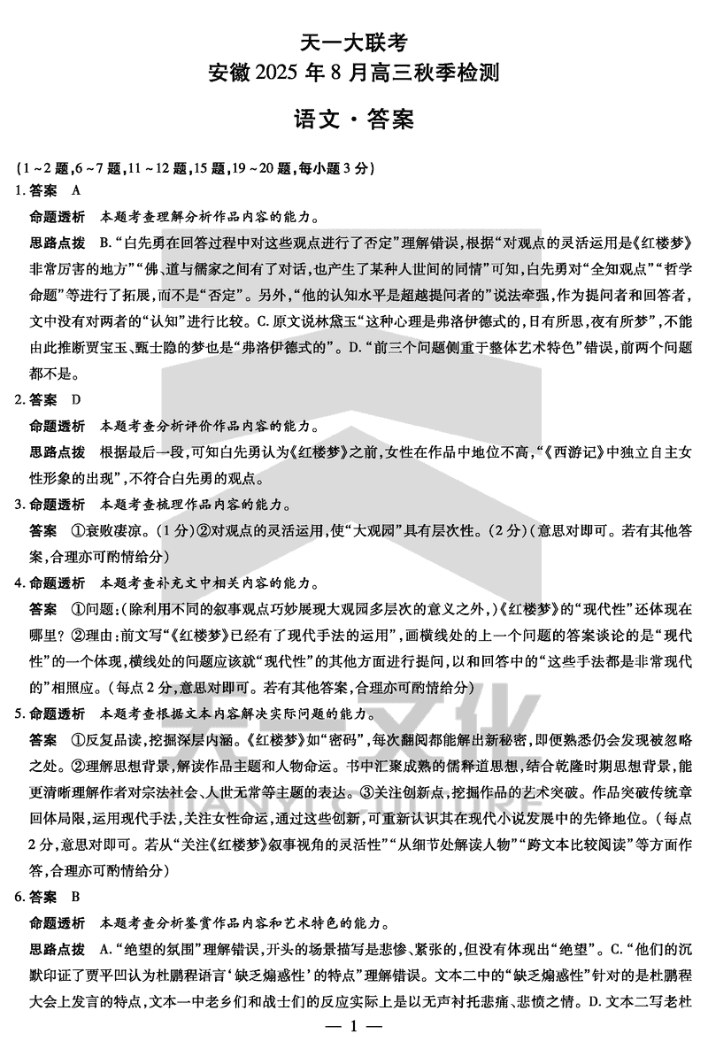 安徽省天一大联考2026届高三8月秋季检测语文考试已于近日开考,为方便考生考后及时查看考试情况,查漏补缺、弥补不足,本文整理了试题答案解析相关信息!