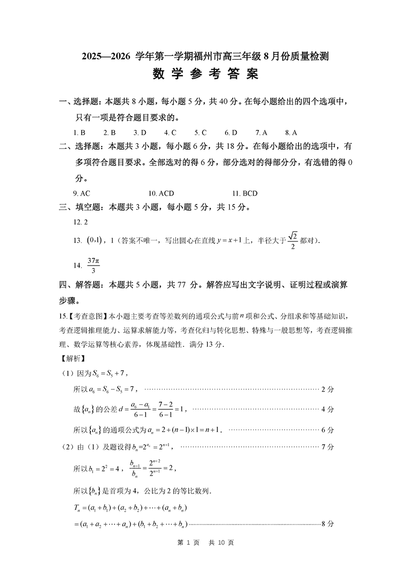 2025-2026学年福州市高三第一次质检数学试题及答案