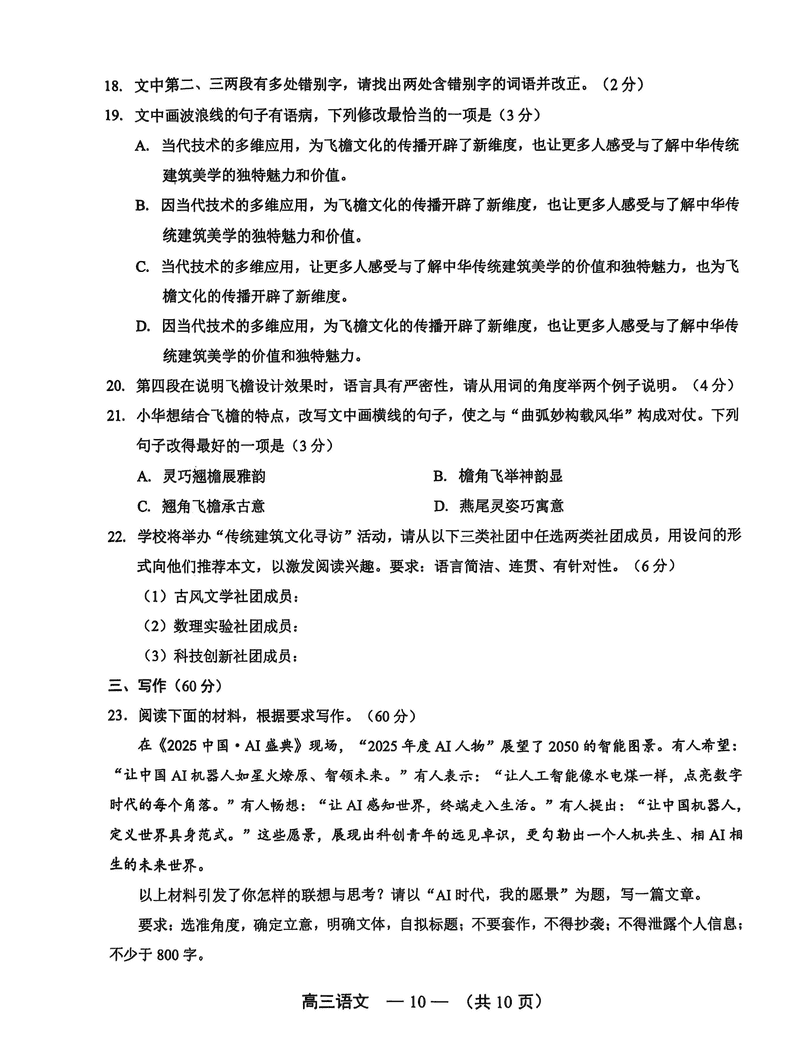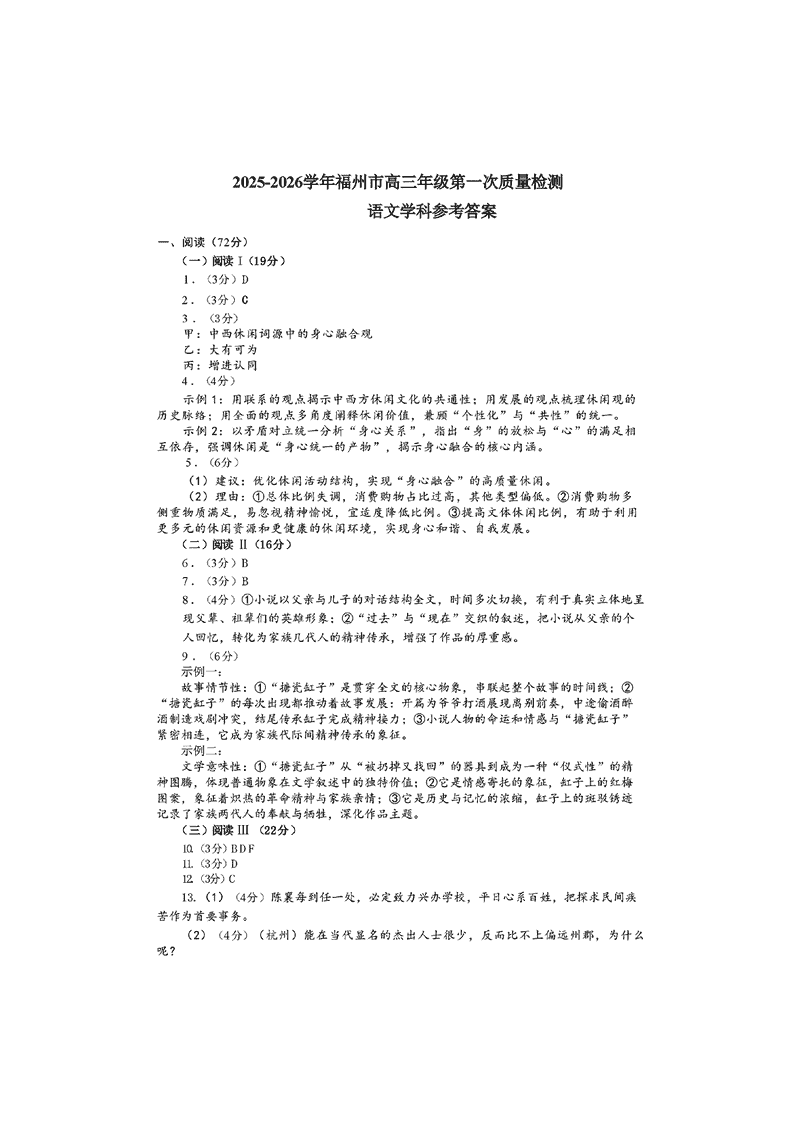 2025-2026学年福州市高三第一次质检语文试题及答案
