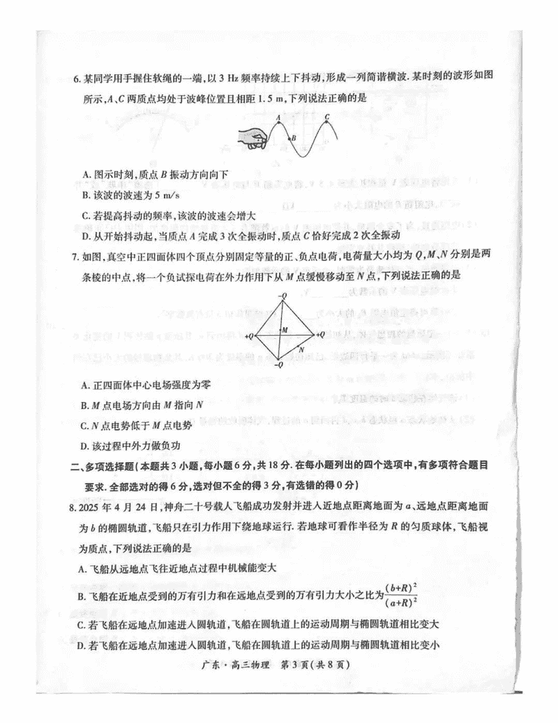 广东上进联考2025-2026学年新高三秋季入学考物理试题及答案