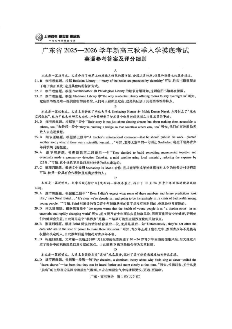广东省上进联考2025-2026学年新高三秋季入学摸底英语考试已于近日开考,为方便考生考后及时查看考试情况,查漏补缺、弥补不足,本文整理了试题答案解析相关信息!