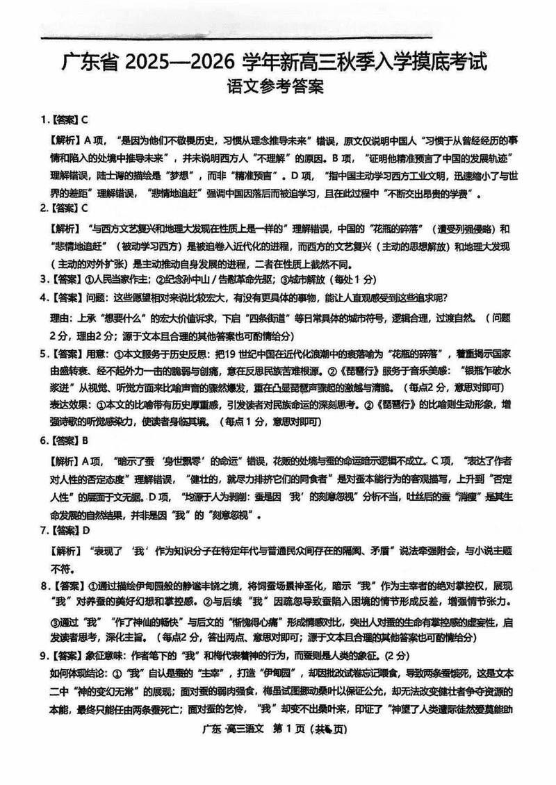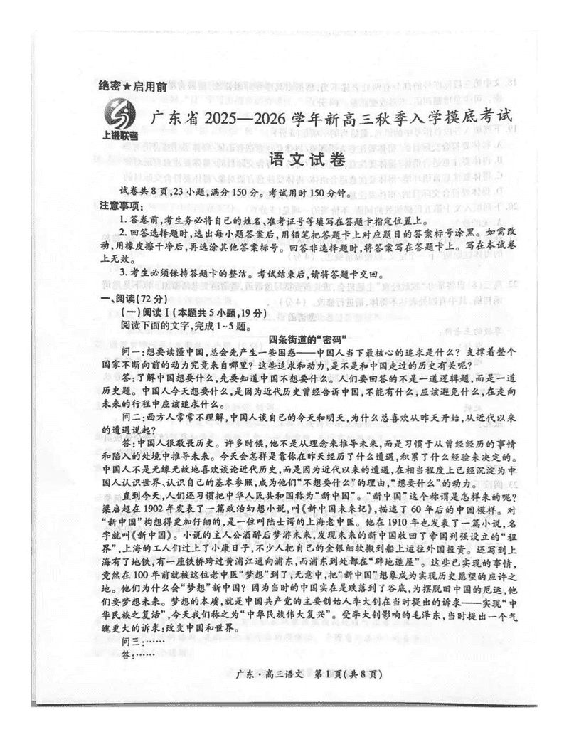 广东省上进联考2025-2026学年新高三秋季入学摸底语文考试已于近日开考,为方便考生考后及时查看考试情况,查漏补缺、弥补不足,本文整理了试题答案解析相关信息!