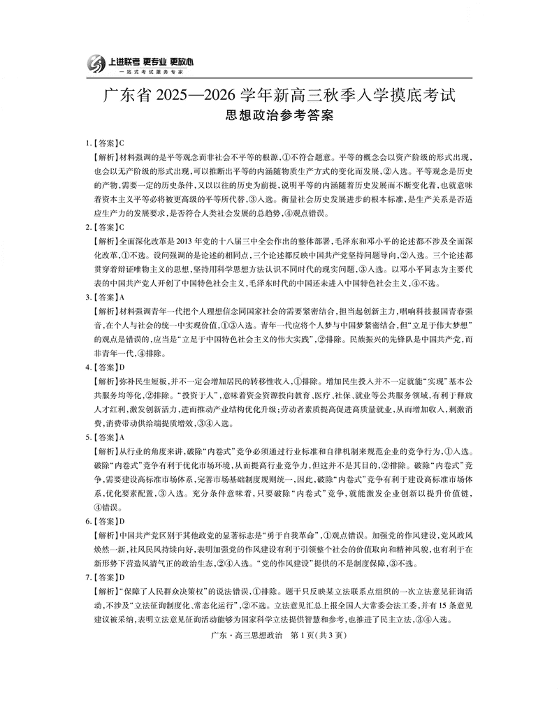 广东省上进联考2025-2026学年新高三秋季入学摸底政治考试已于近日开考,为方便考生考后及时查看考试情况,查漏补缺、弥补不足,本文整理了试题答案解析相关信息!
