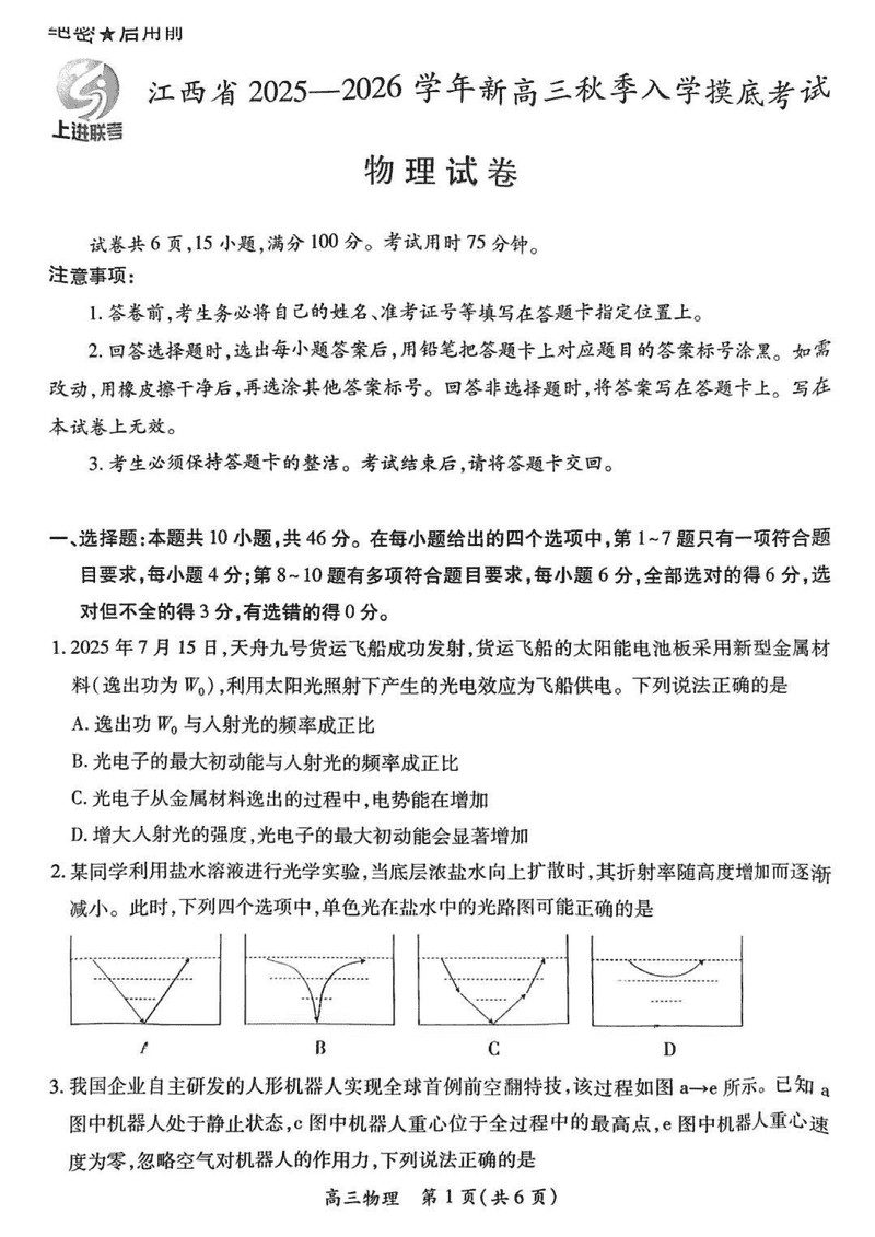 江西省上进联考2025-2026学年新高三秋季入学摸底物理考试已于近日开考,为方便考生考后及时查看考试情况,查漏补缺、弥补不足,本文整理了试题答案解析相关信息!