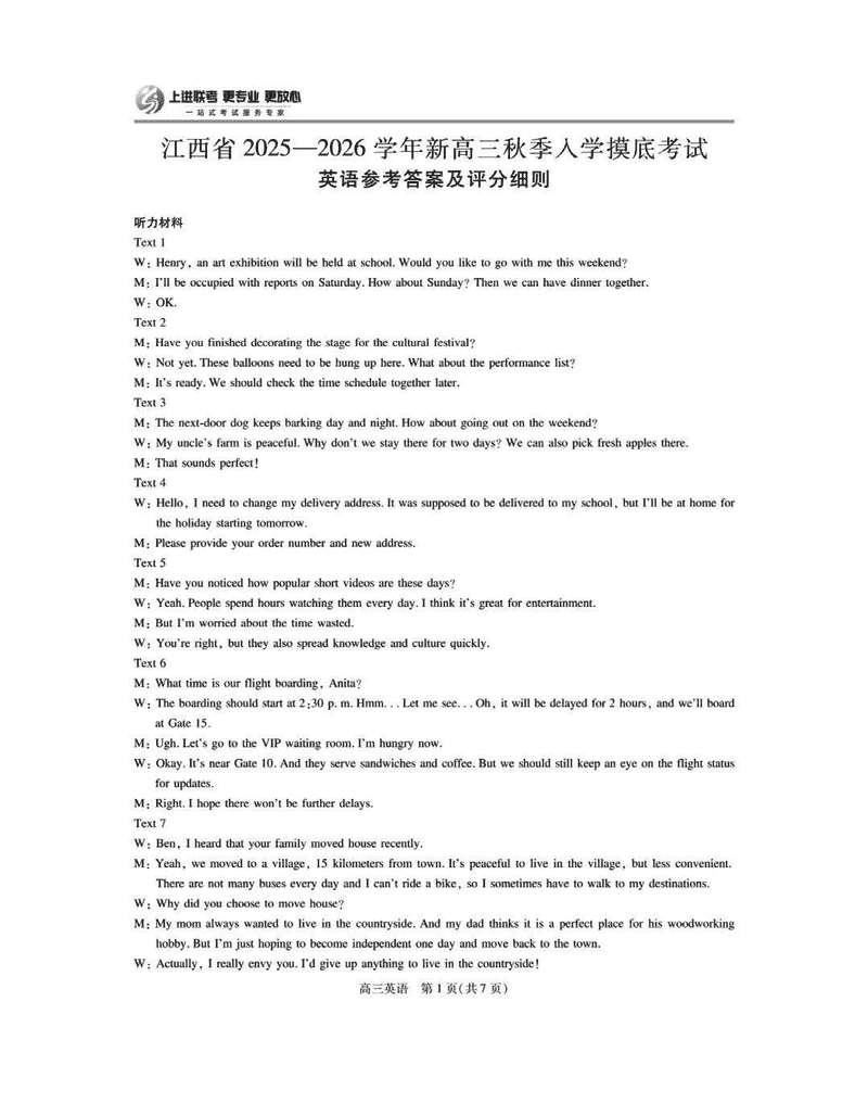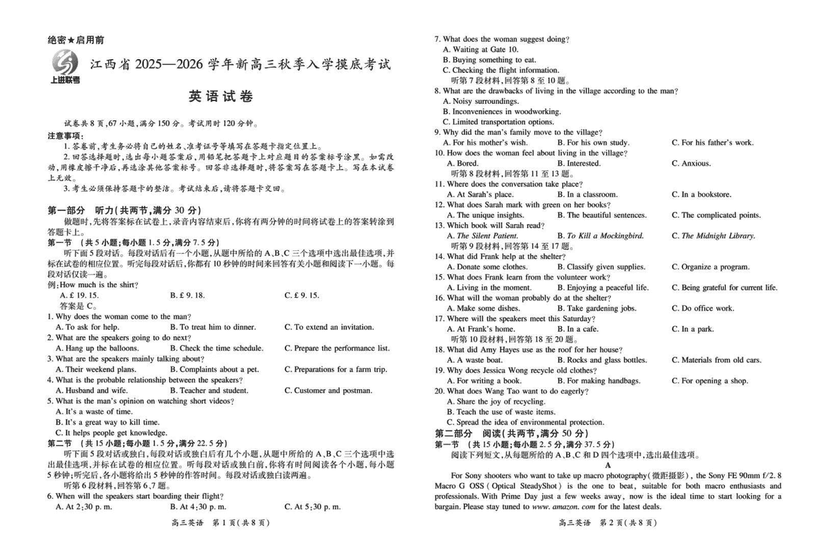江西省上进联考2025-2026学年新高三秋季入学摸底英语考试已于近日开考,为方便考生考后及时查看考试情况,查漏补缺、弥补不足,本文整理了试题答案解析相关信息!