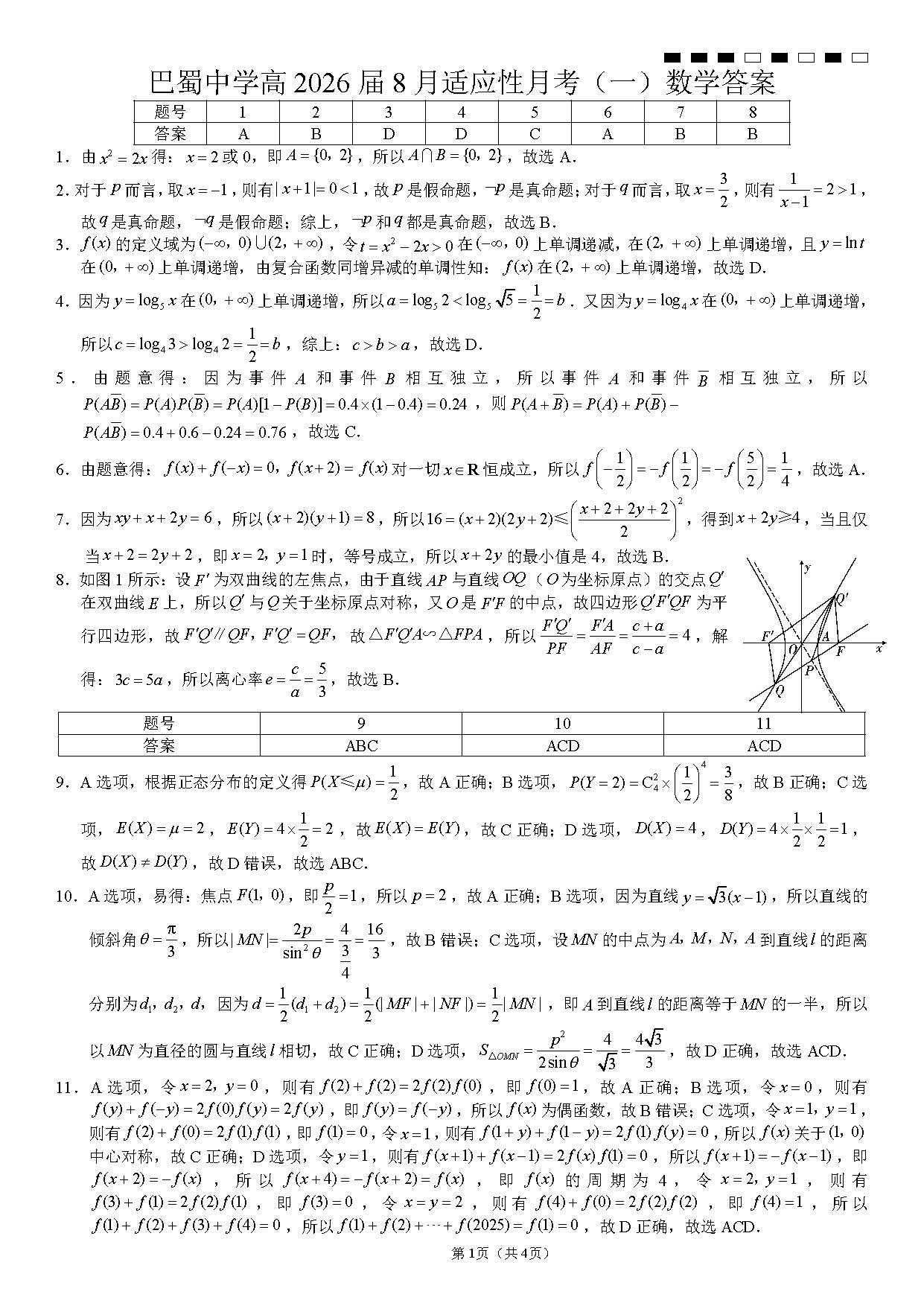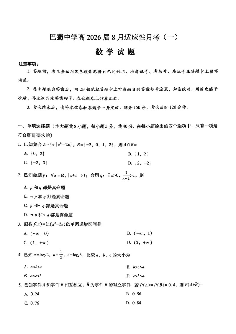 重庆市巴蜀中学2026届高三8月高考适应性月考(一)数学考试已于近日开考,为方便考生考后及时查看考试情况,查漏补缺、弥补不足,本文整理了试题答案解析相关信息!