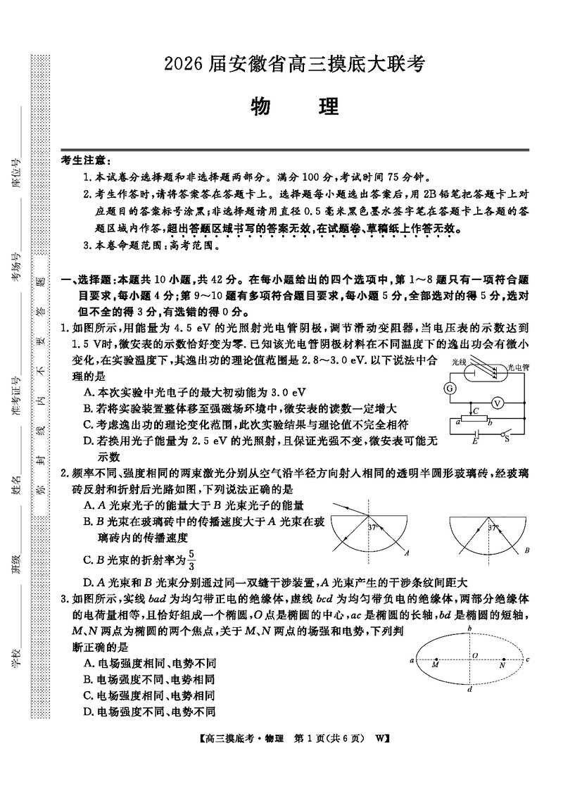皖南八校2026届高三上学期8月摸底大联考物理考试已于近日开考,为方便考生考后及时查看考试情况,查漏补缺、弥补不足,本文整理了试题答案解析相关信息!