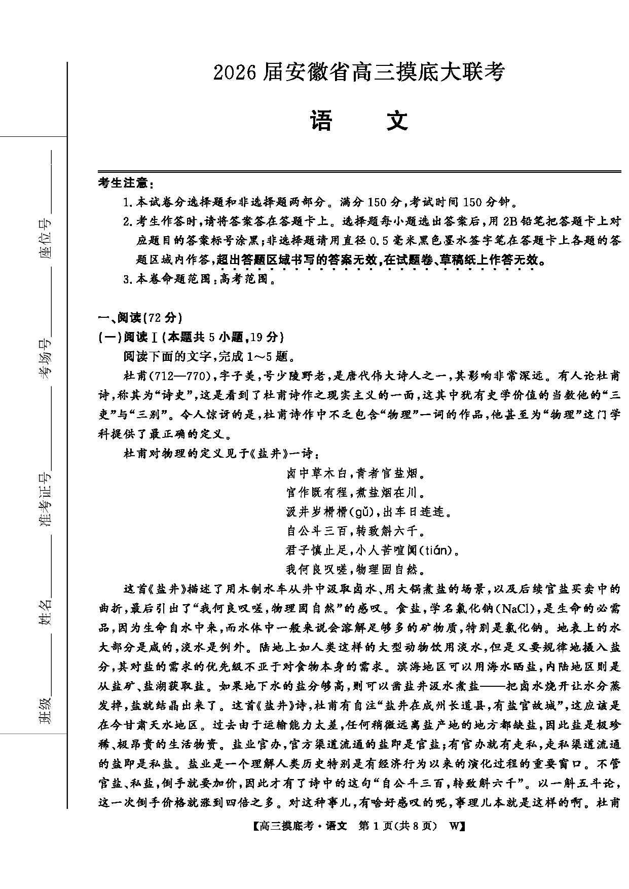 皖南八校2026届高三上学期8月摸底大联考语文考试已于近日开考,为方便考生考后及时查看考试情况,查漏补缺、弥补不足,本文整理了试题答案解析相关信息!