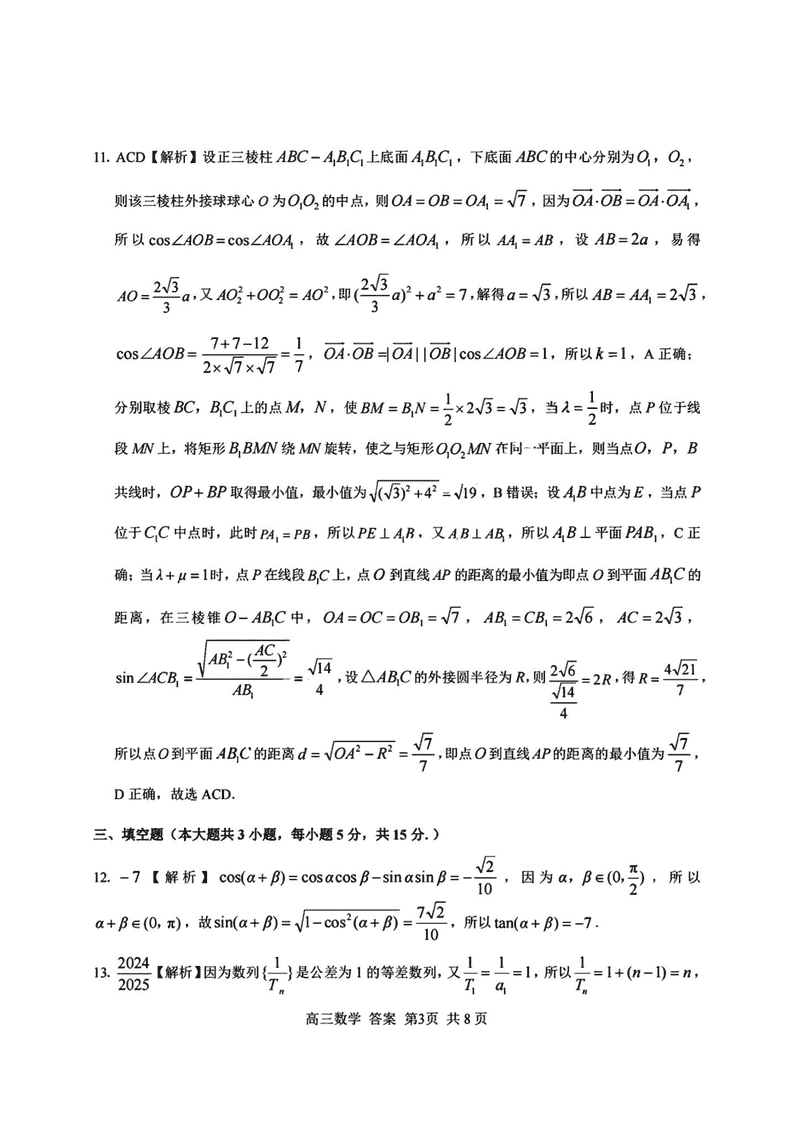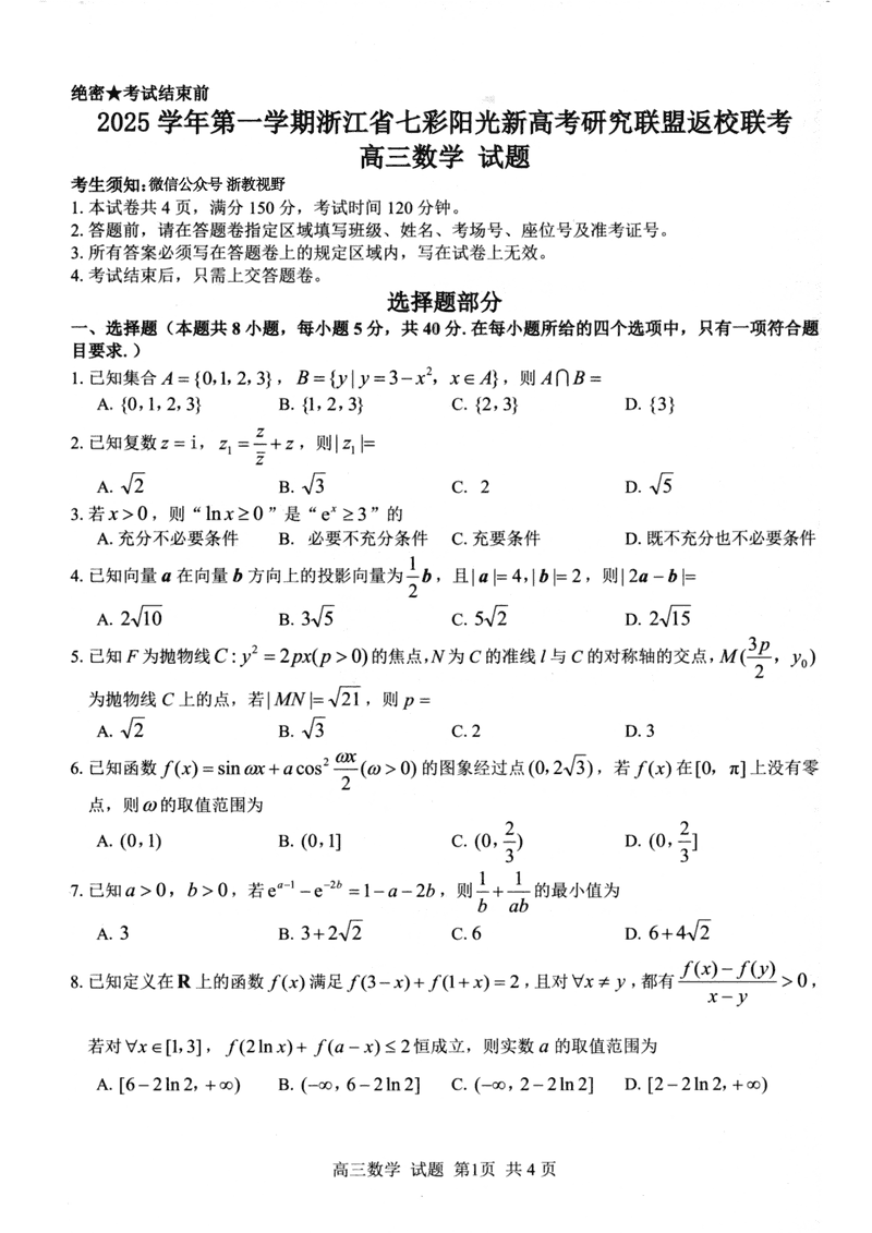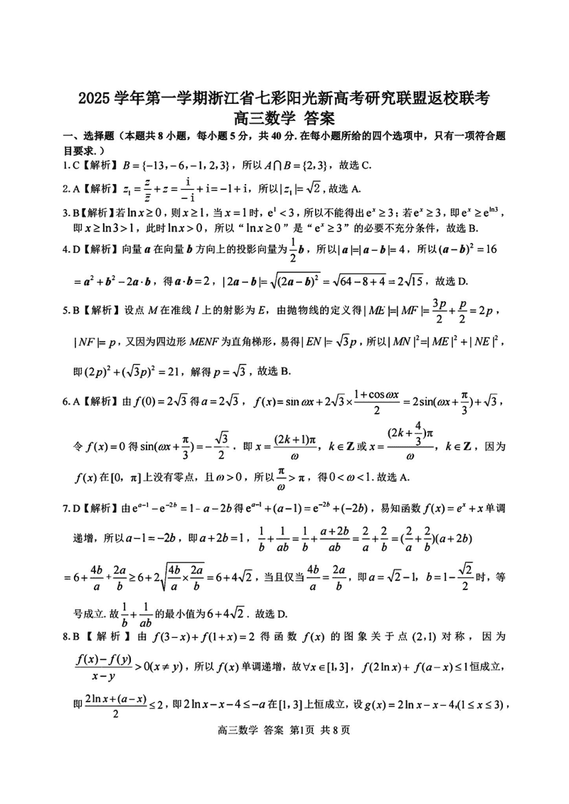 2025年8月浙江七彩阳光新高考研究联盟暑假返校联考数学试题及答案 时间:2025-08-31 浙江 数学试题 浙江省七彩阳光新高考研究联盟2026届高三上学期返校联考数学考试已于近日开考,为方便考生考后及时查看考试情况,查漏补缺、弥补不足,本文整理了试题答案解析相关信息! 汇总:2025年8月浙江七彩阳光新高考研究联盟暑假返校联考 数学试题及答案解析
