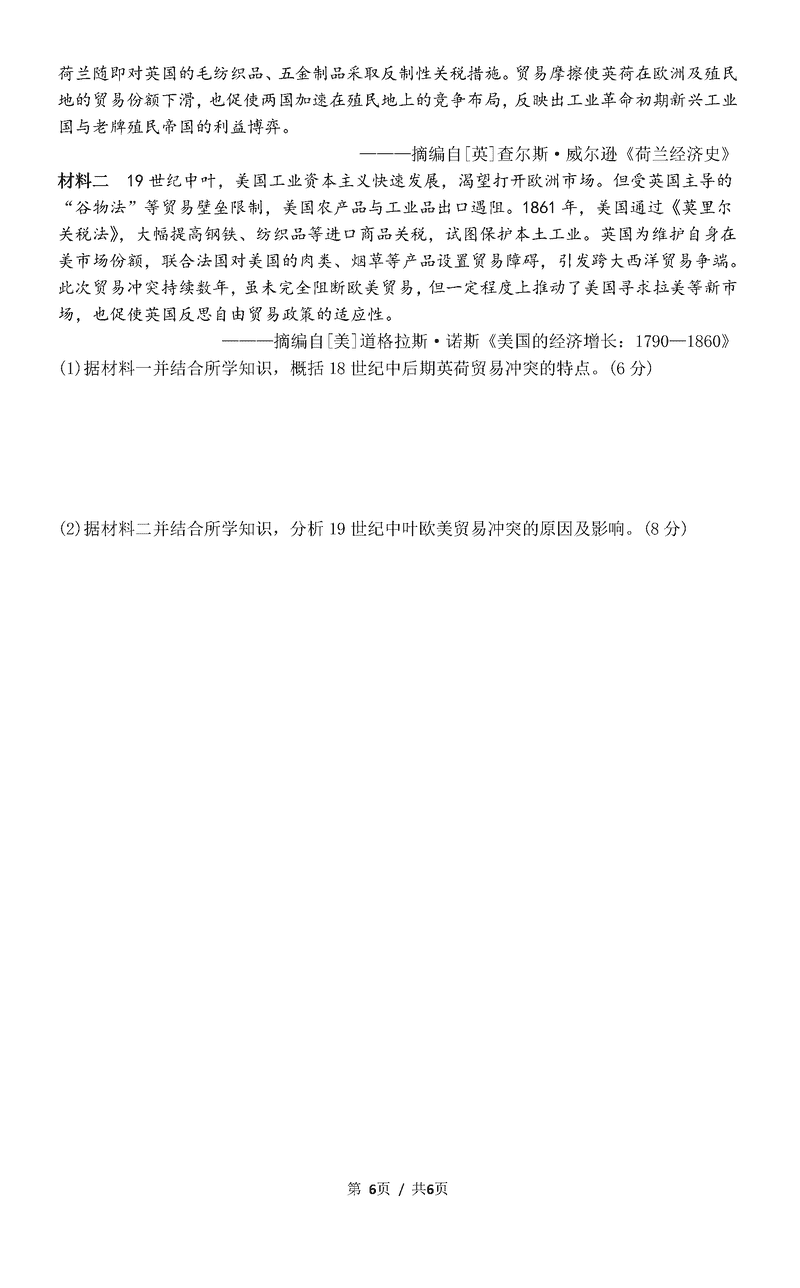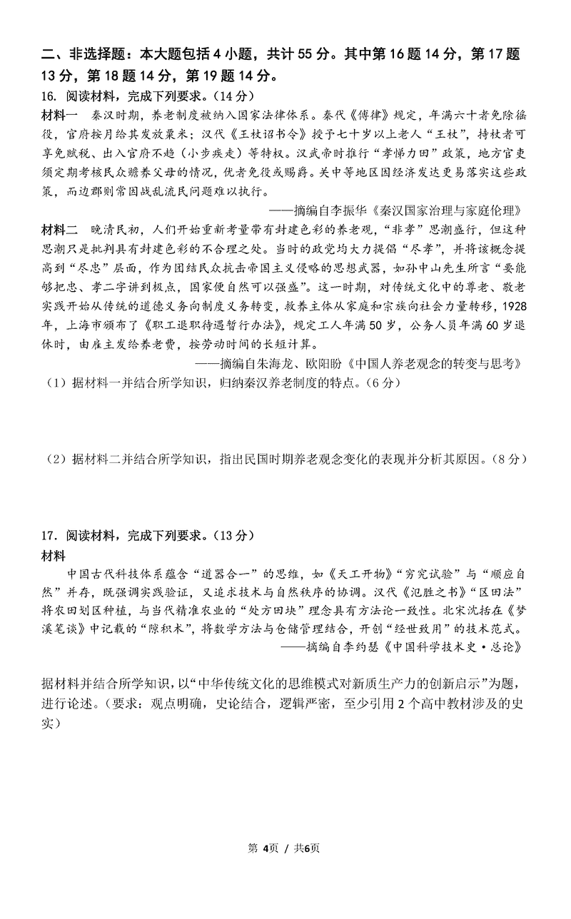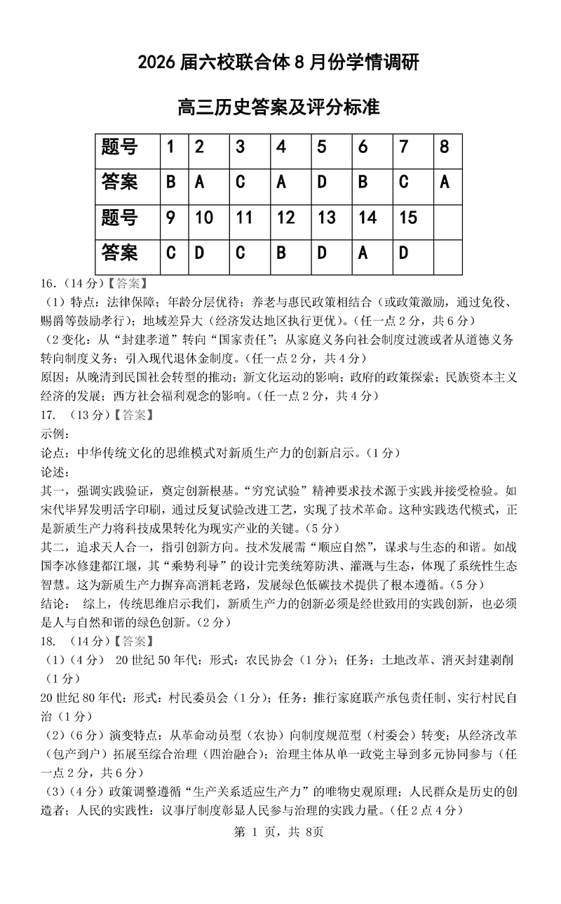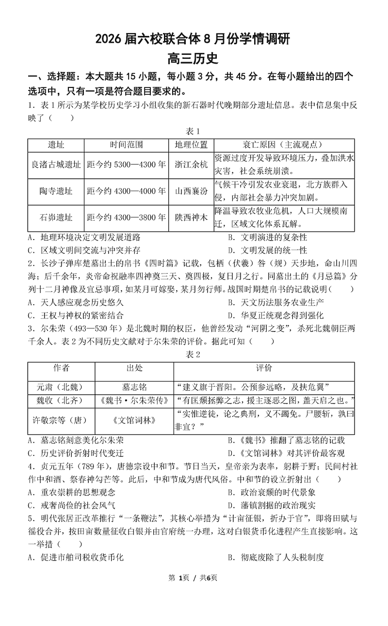 南京市六校联合体2026届高三上学期8月学情调研历史试题及答案