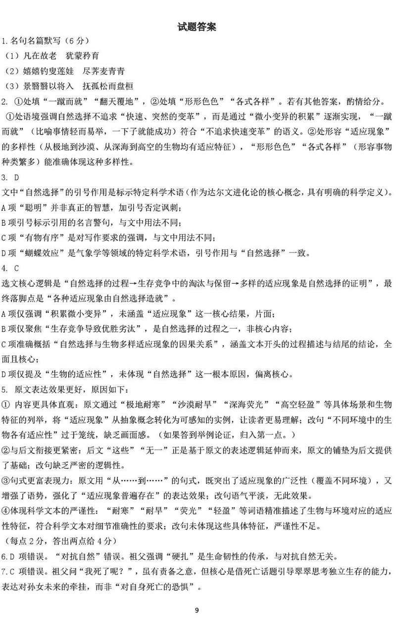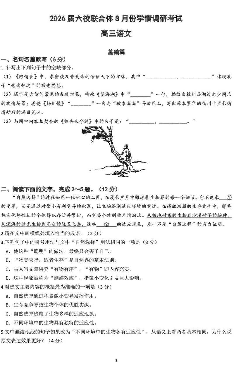 南京市六校联合体2026届高三上学期8月学情调研语文试题及答案
