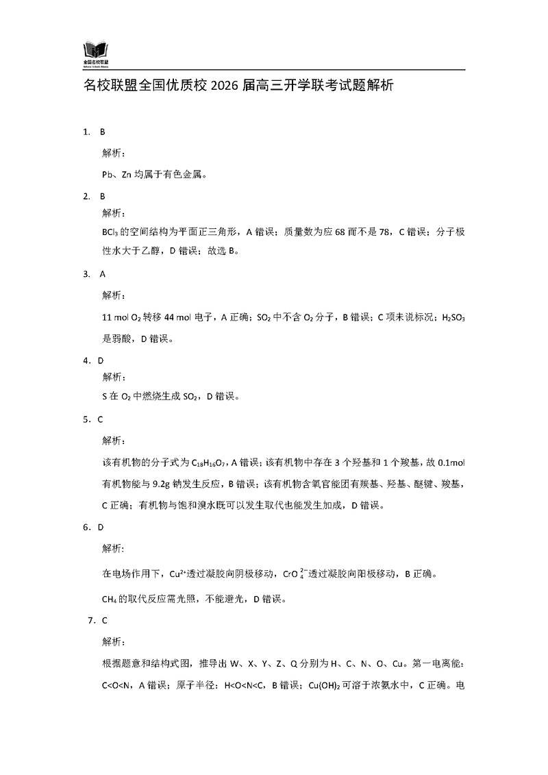 内蒙古-全国名校联盟2026届高三联合开学摸底化学考试已于近日开考,为方便考生考后及时查看考试情况,查漏补缺、弥补不足,本文整理了试题答案解析相关信息!